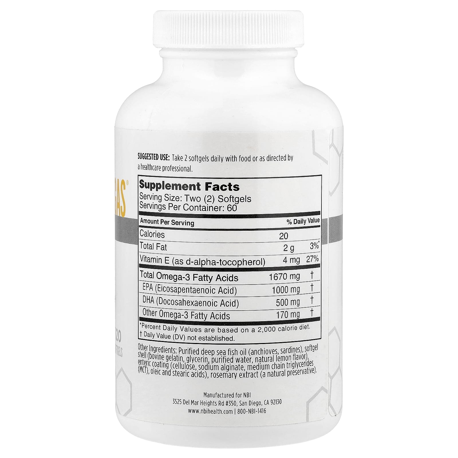 Очищенный жир глубоководных рыб (анчоус, сардины), оболочка капсулы (бычий желатин, глицерин, очищенная вода, натуральный лимонный ароматизатор) кишечнорастворимая оболочка (целлюлоза, альгинат натрия, среднецепочечные триглицериды (МСТ), олеиновая и стеариновая кислоты), экстракт розмарина (натуральный консервант).