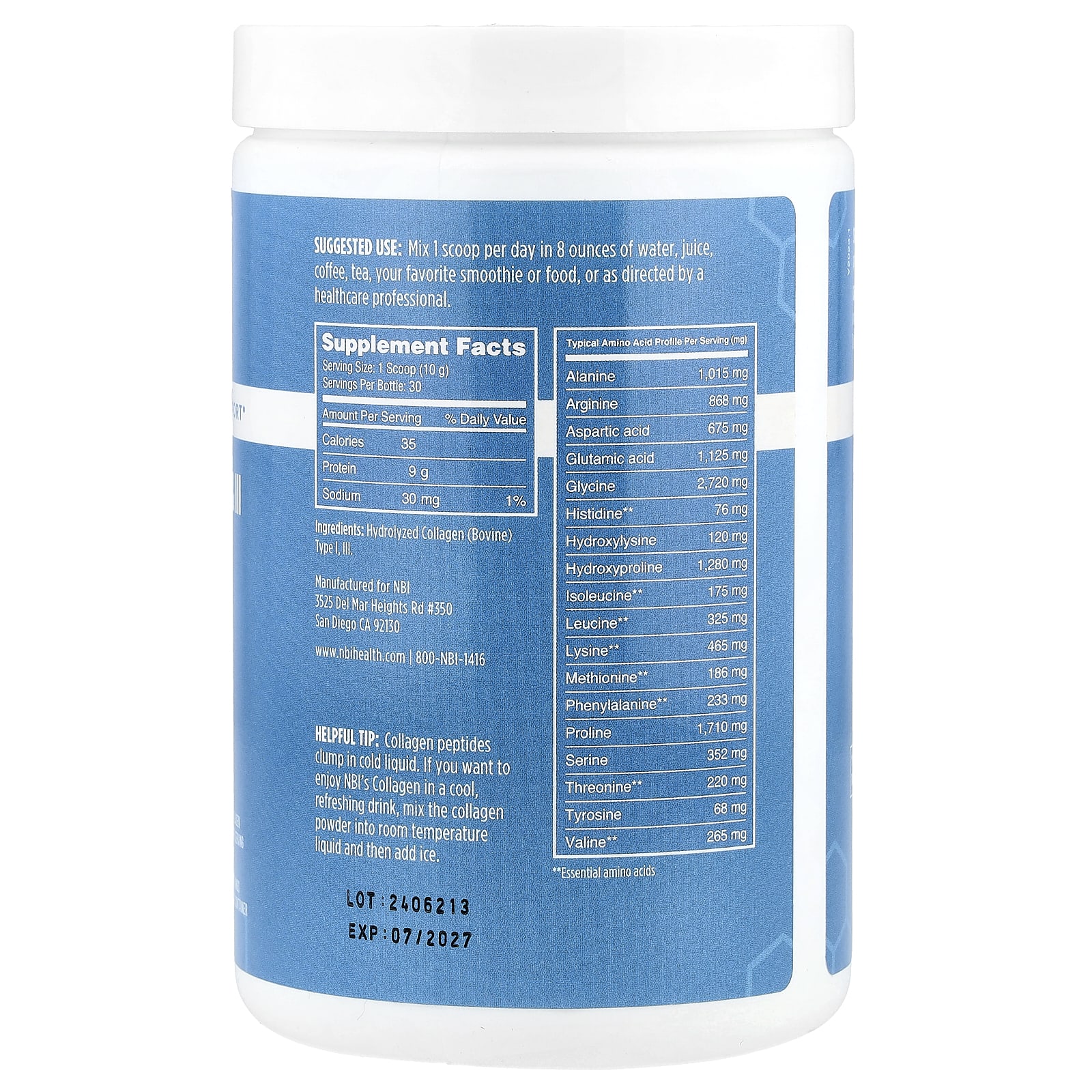 Полезный совет. Пептиды коллагена слипаются в холодной жидкости. Если вы хотите насладиться коллагеном NBI в виде прохладного освежающего напитка, смешайте порошок коллагена с жидкостью комнатной температуры, а затем добавьте лед.