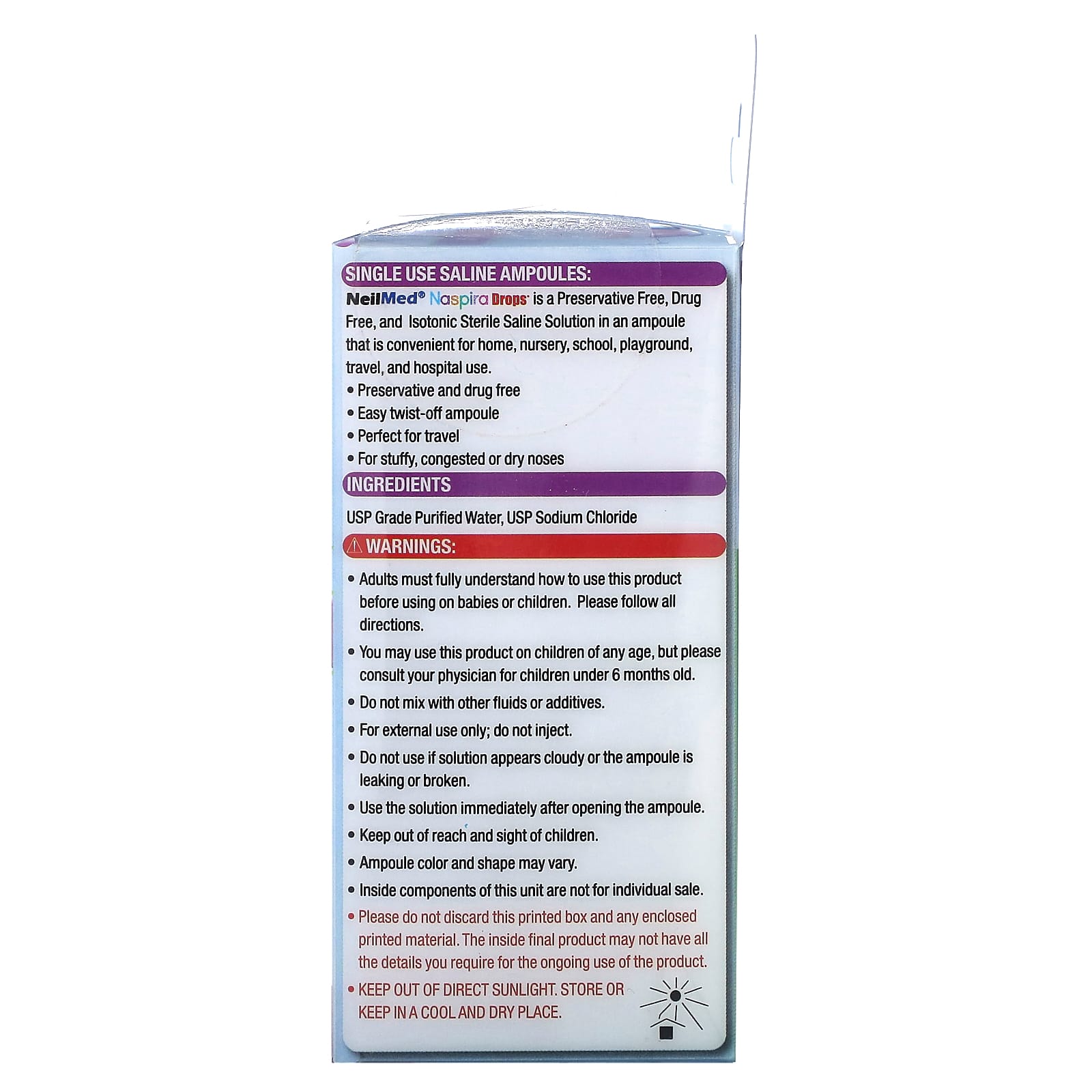 NeilMed Naspira Drops - это изотонический и изотонический солевой раствор в ампуле, не содержащий консервантов, который подходит для использования дома, в детском саду, в школе, на игровой площадке, в путешествиях и в больнице.