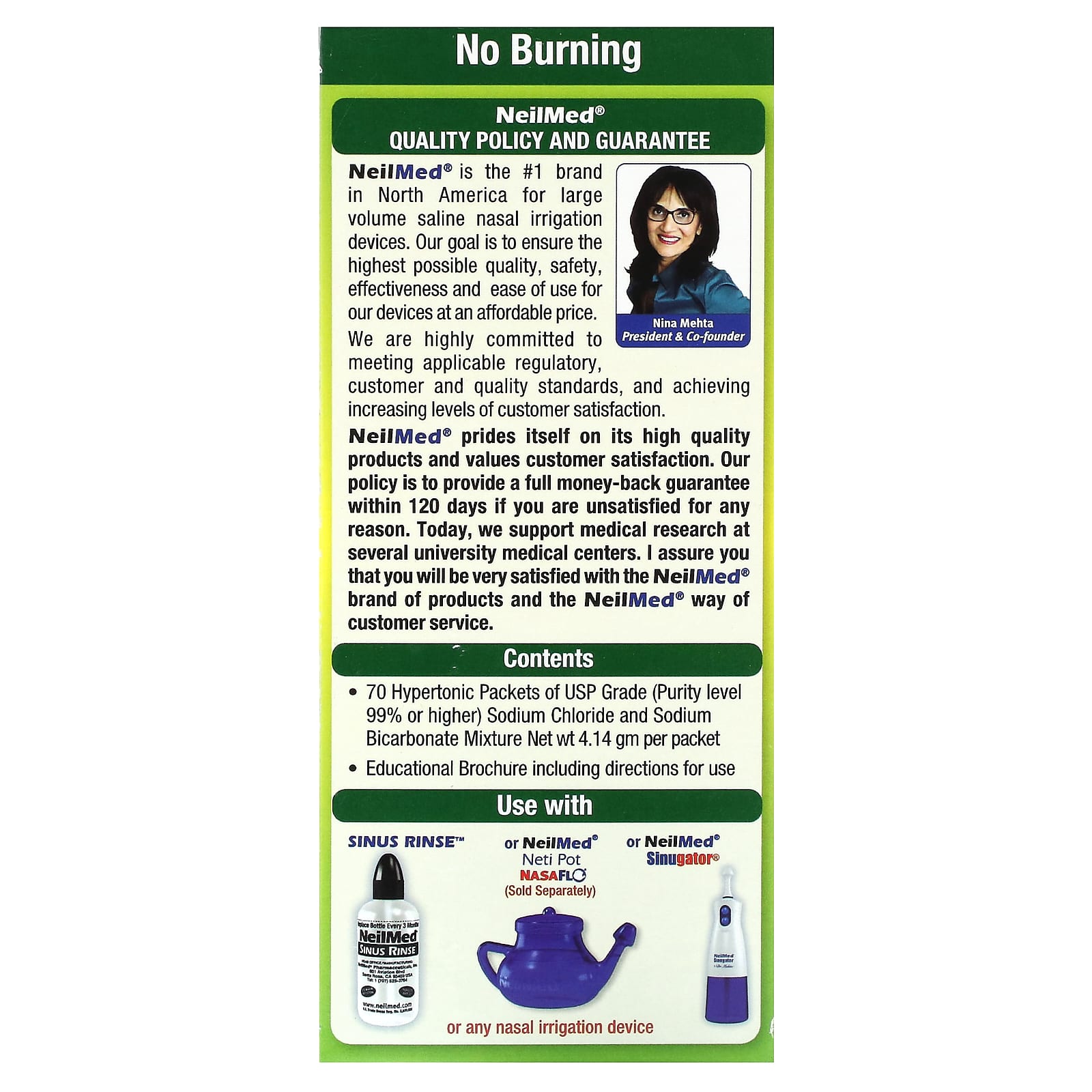 Изотонический солевой раствор содержит 9 мг хлорида натрия на мл воды. Любая концентрация выше указанной определяется как гипертоническая. Ограниченное количество исследований показывает, что гипертонический солевой раствор может более эффективно уменьшать заложенность слизистой оболочки носа при краткосрочном приеме в течение нескольких часов. Теория заключается в том, что гипертонический раствор вытягивает воду из закупоренных тканей носа. Гипертонический раствор может вызвать временное жжение или покалывание. Если вы испытываете жжение или дискомфорт, используйте изотонический раствор. Для удобства один синий пакетик NeilMed® в 240 мл воды является изотоническим, а один зеленый пакетик на 240 мл — гипертоническим.
