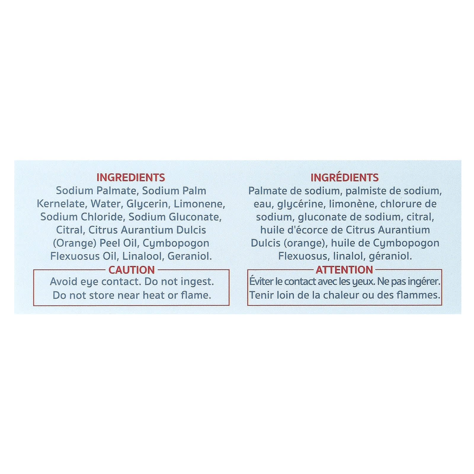 Пальмитат натрия, пальмовый кернелат натрия, вода, глицерин, лимонен, хлорид натрия, глюконат натрия, цитраль, масло из цедры апельсина (Citrus aurantium dulcis), масло лемонграсса (Cymbopogon flexuosus), линалоол, гераниол.