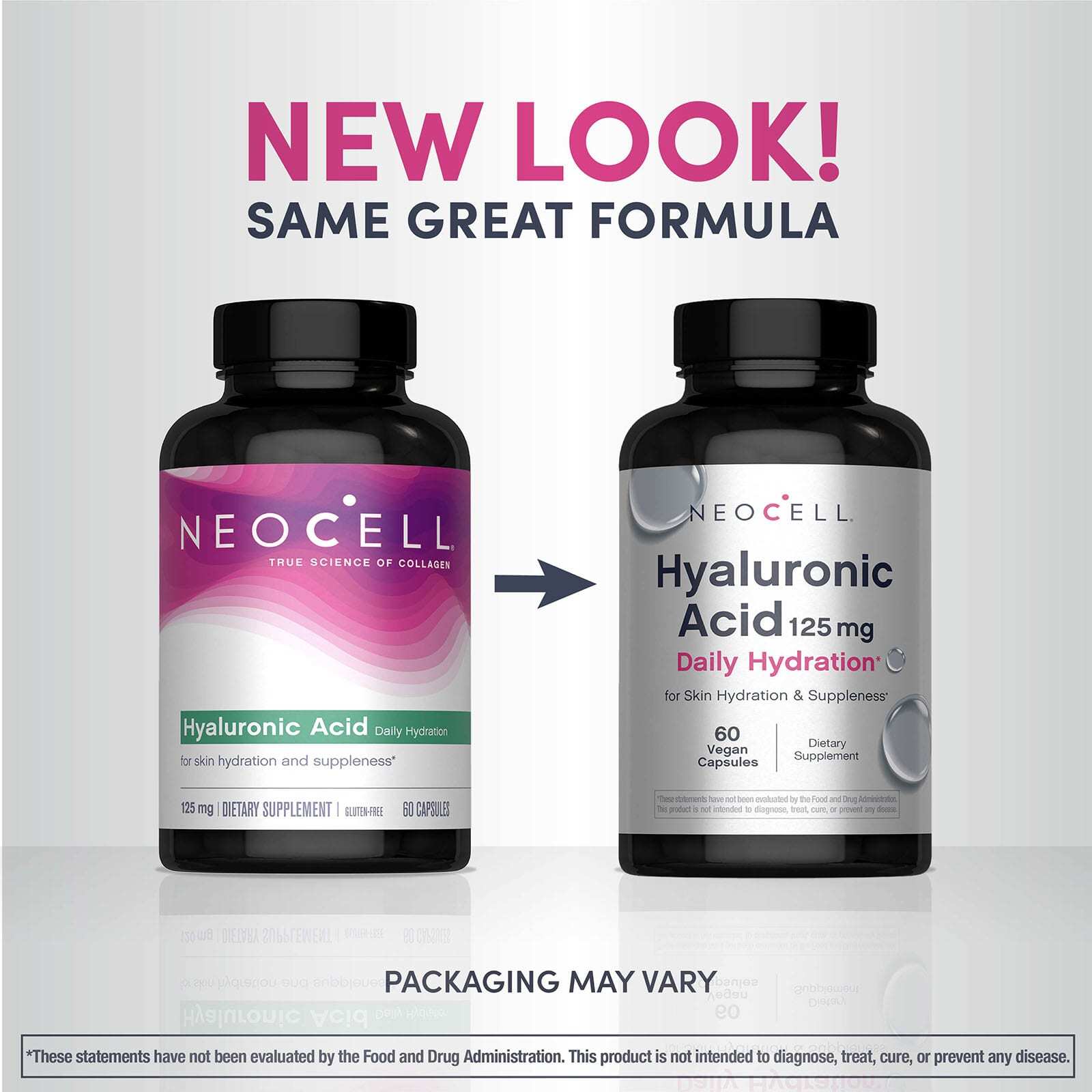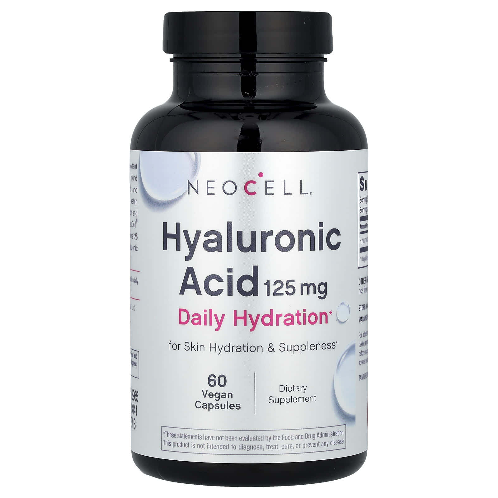 Гиалуроновая кислота (ГК) - важный компонент увлажнения кожи. ГК содержится практически в каждой ткани организма и способна переносить большое количество воды, обеспечивая гидратацию тканей и транспорт воды между клетками. Ежедневное увлажнение с гиалуроновой кислотой NeoCell R содержит 125 мг веганской и биодоступной гиалуроновой кислоты в одной небольшой таблетке, которую легко принимать.