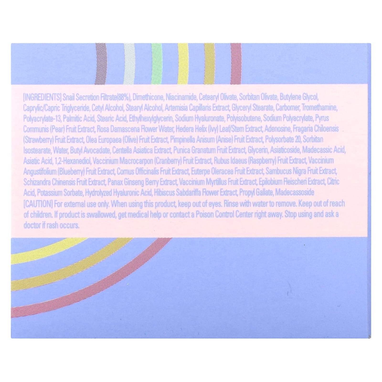 Фильтрат секрета улитки (88%), диметикон, никотинамид, цетеарил оливат, сорбитан оливат, бутиленгликоль, каприловый/каприновый триглицерид, цетиловый спирт, стеариловый спирт, экстракт полыни волосовидной (Artemisia capillaris), глицерил стеарат, карбомер, трометамин, полиакрилат-13, пальмитиновая кислота, стеариновая кислота, этилгексилглицерин, гиалуронат натрия, полиизобутен, полиакрилат натрия, экстракт плодов груши (Pyrus communis), вода из цветков дамасской розы (Rosa damascena), экстракт листьев / стеблей плюща (Hedera helix), аденозин, экстракт ягод клубники (Fragaria chiloensis), оливковое масло (Olea europaea), экстракт плодов аниса (Pimpinella anisum), полисорбат 20, сорбитан изостеарат, вода, бутил авокадат, экстракт готу колы (Centella asiatica), экстракт плодов граната (Punica granatum), глицерин, азиатикозид, мадекассовая кислота, азиатиковая кислота, 1,2-гександиол, экстракт ягод клюквы (Vaccinium macrocarpon), экстракт ягод малины (Rubus idaeus), экстракт ягод голубики (Vaccinium angustifolium), экстракт плодов комуса лекарственного, экстракт ягод асаи (Euterpe oleracea), экстракт ягод бузины (Sambucus nigra), экстракт плодов лимонника китайского (Schizandra chinensis), экстракт ягод женьшеня обыкновенного (Panax ginseng), экстракт ягод черники (Vaccinium myrtillus), экстракт эпилобиума (Epilobium fleischeri), лимонная кислота, сорбат калия, гидролизованная гиалуроновая кислота, экстракт цветков розеллы (Hibiscus sabdariffa), пропилгаллат, мадекассосид.