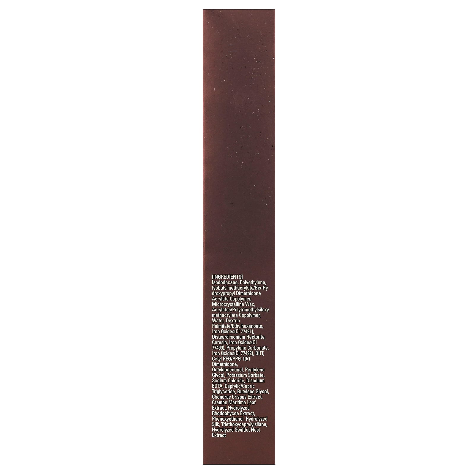 изододекан, полиэтилен, изобутилметакрилат/бис-гидроксипропил диметикон акрилат сополимер, микрокристаллический воск, акрилат/политриметилсилоксиметакрилат сополимер, вода, декстрин пальмитат/этилгексаноат, оксиды железа (CI 77491), дистеардимония гекторит, церезин, оксиды железа (CI 77499), пропиленкарбонат, оксиды железа (CI 77492), бутилгидрокситолуол, церил ПЭГ/ППГ-10/1 диметикон, октилдодеканол, пентилен гликоль, сорбат калия, хлорид натрия, двунатриевая ЭДТК, каприловый/каприновый триглицерид, бутиленгликоль, экстракт ирландского мха (Chondrus crispus), экстракт листьев катрана морского (Crambe maritima), гидролизованный экстракт родиолы розовой (Rhodophyceae), феноксиэтанол, гидролизованный шелк, триэтоксикаприлилсилан, гидролизованный экстракт сафлора и муравьиного дерева.