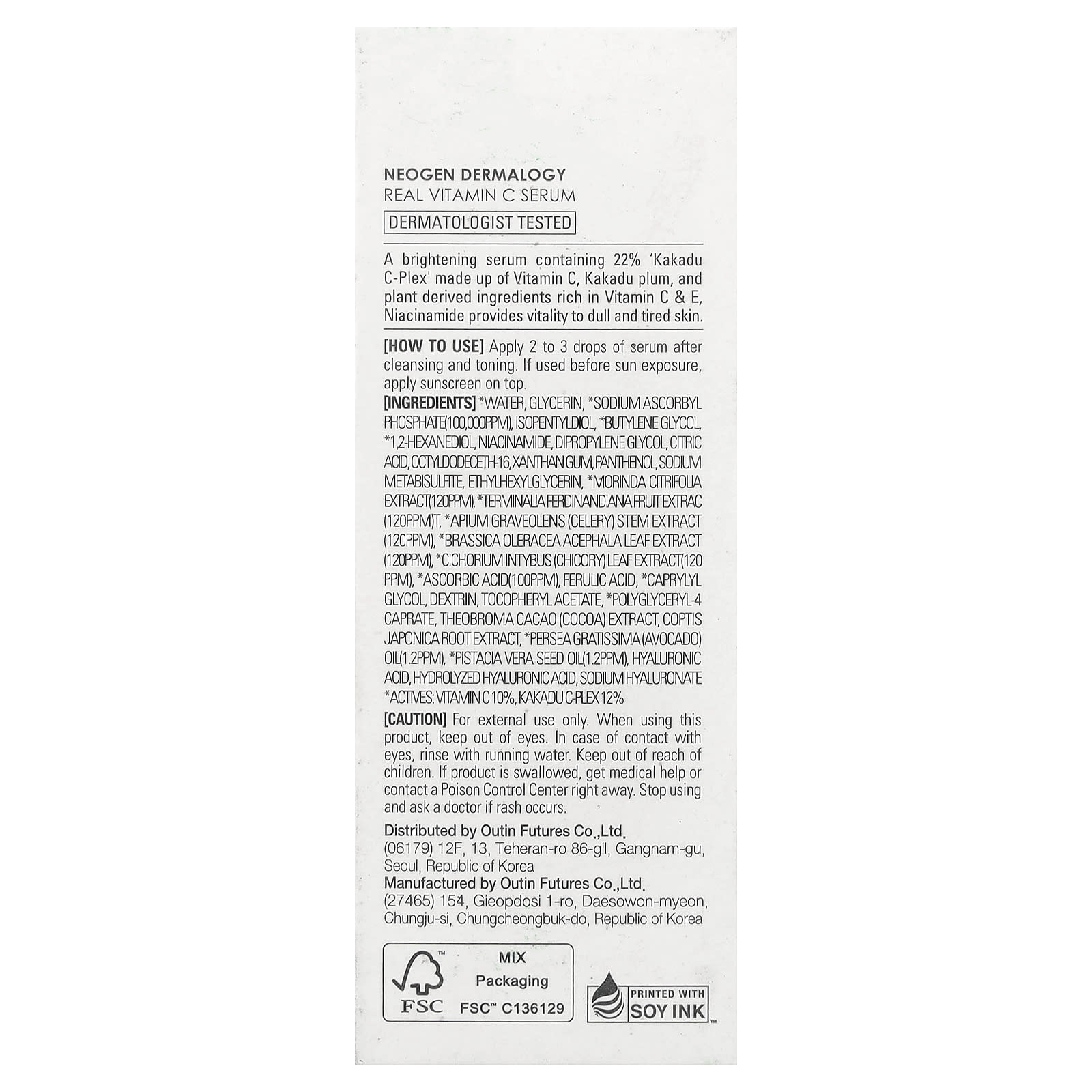 * Вода, глицерин, аскорбил фосфат натрия (100 000 част./млн)*, изопентилдиол, * бутиленгликоль, * 1,2-гександиол, никотинамид, дипропиленгликоль, лимонная кислота, октилдодецет-16, ксантановая камедь, пантенол, метабисульфит натрия, этилгексилглицерин, экстракт нони (Morinda citrifolia) (120 част./млн)*, экстракт плодов сливы какаду (Terminalia ferdinandiana) (120 част./млн)*, экстракт стеблей сельдерея (Apium graveolens) (120 част./млн)*, экстракт листьев капусты огородной (Brassica oleracea aphaela) (120 част./млн)*, экстракт листьев цикория (Cichorium intybus) (120 част./млн)*, аскорбиновая кислота (100 част./млн)*, феруловая кислота, * каприлилгликоль, декстрин, токоферилацетат, полиглицерил-4 капрат*, экстракт какао (Theobroma cacao), экстракт корня коптиса японского (Coptis japonica), масло авокадо (Persea gratissima) (1,2 част./млн)*, масло семян фисташки (Pistacia vera)* (1,2 част./млн)*, гиалуроновая кислота, гидролизованная гиалуроновая кислота, гиалуронат натрия.