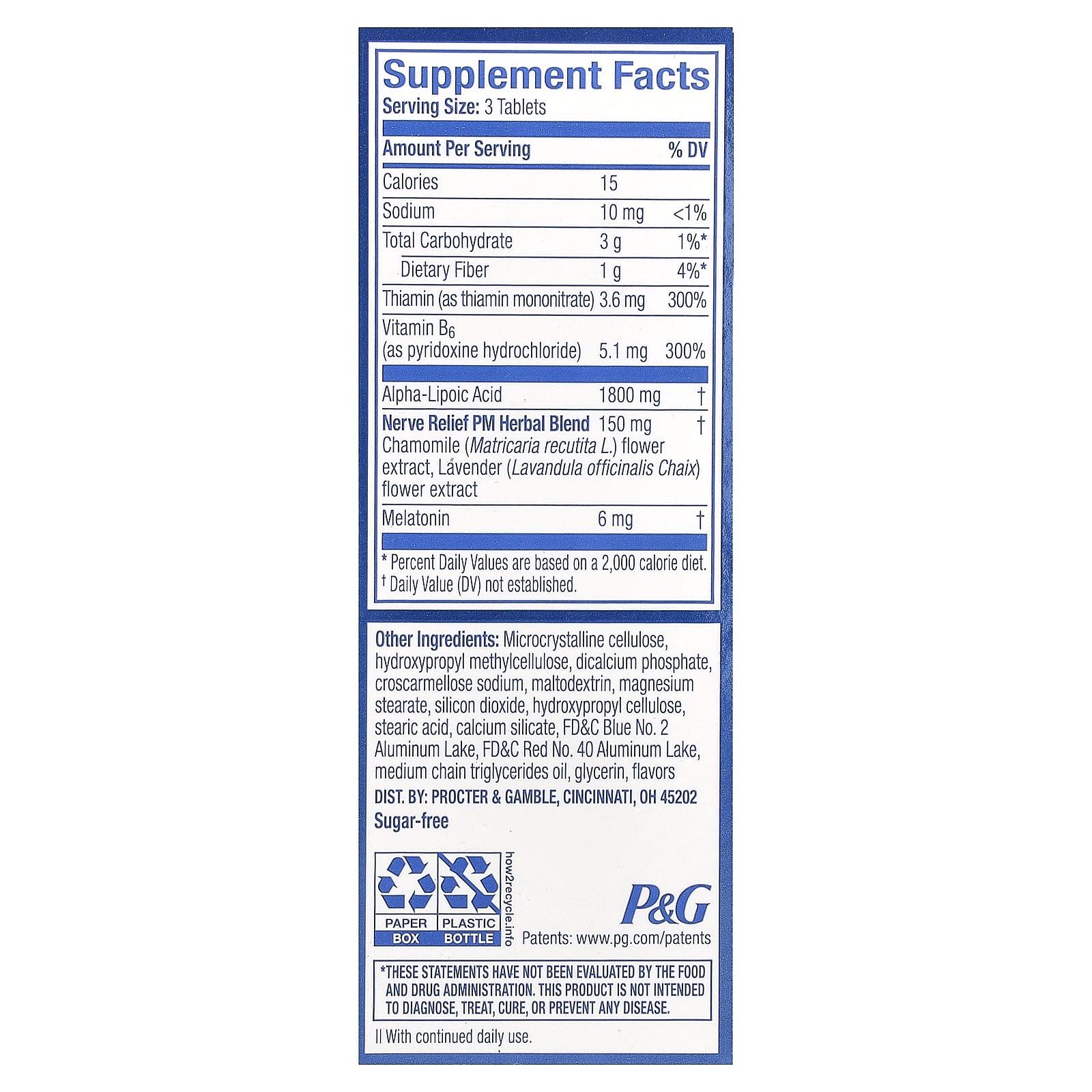 Микрокристаллическая целлюлоза, гидроксипропилметилцеллюлоза, дикальций фосфат, кроскармеллоза натрия, мальтодекстрин, стеарат магния, диоксид кремния, гидроксипропилцеллюлоза, стеариновая кислота, силикат кальция, краситель синий FD&C 2 лака алюминия, краситель красный FD&C 40 алюминиевый лак, масло среднецепочечных триглицеридов, глицерин, ароматизаторов.