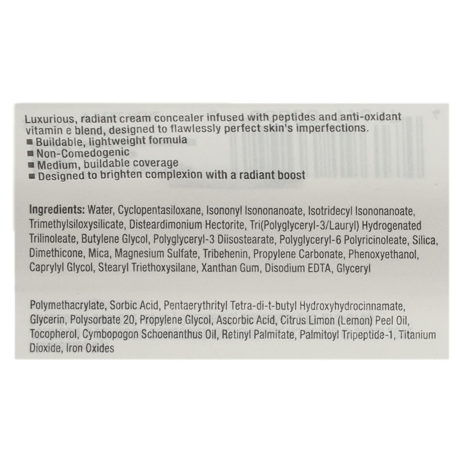 Роскошный крем-консилер для сияния кожи, обогащенный пептидами и смесью антиоксидантов и витамина Е, предназначенный для безупречного устранения недостатков кожи.