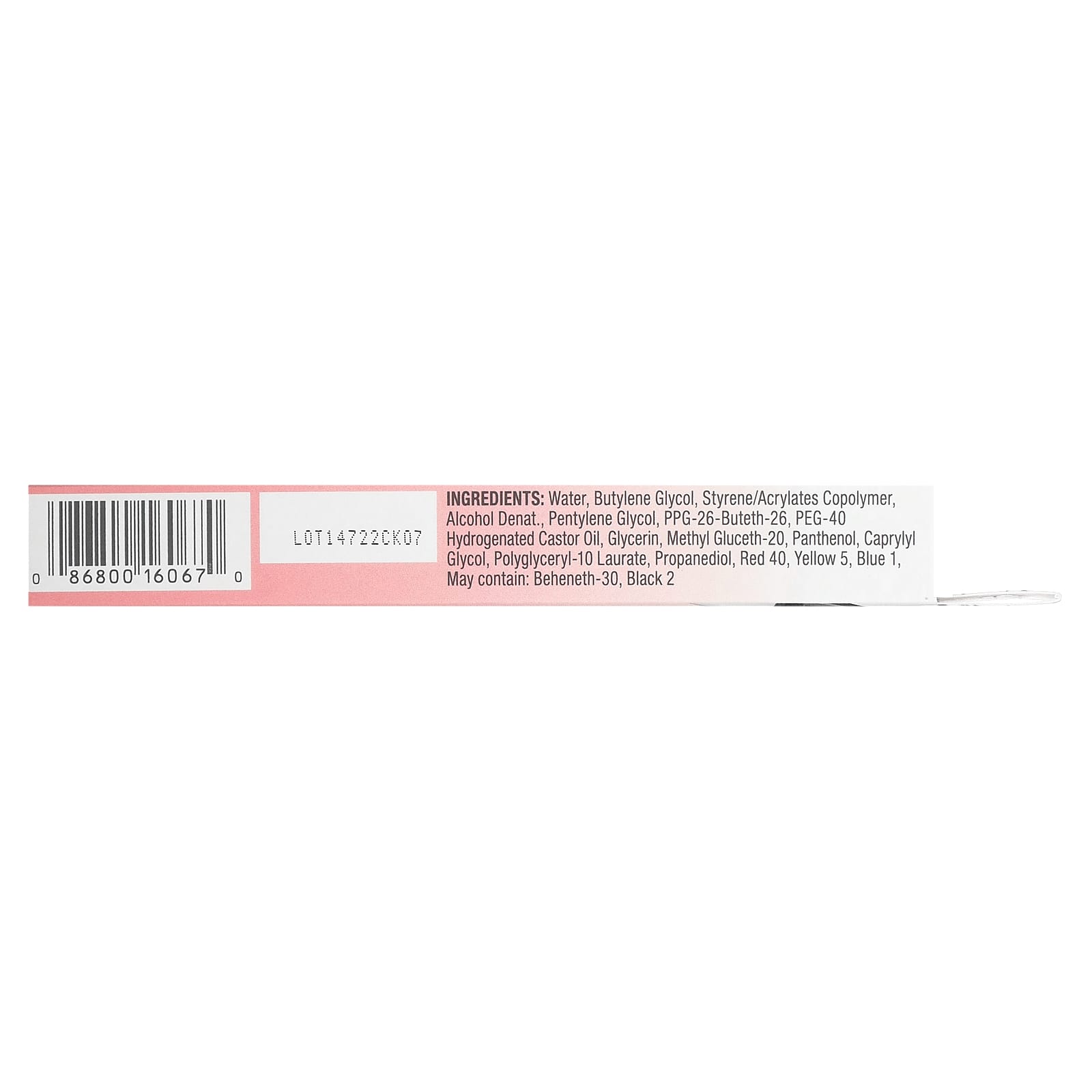 Вода, бутиленгликоль, сополимер стирола и акрилатов, денатный спирт., пентилен гликоль, ППГ-26-бутет-26, ПЭГ-40 гидрогенизированное касторовое масло, глицерин, метил глюцет-20, пантенол, каприлилгликоль, полиглицерил-10 лаурат, пропандиол, краситель красный 40, краситель желтый 5, краситель синий 1, может содержать бегенет-30, черный 2.