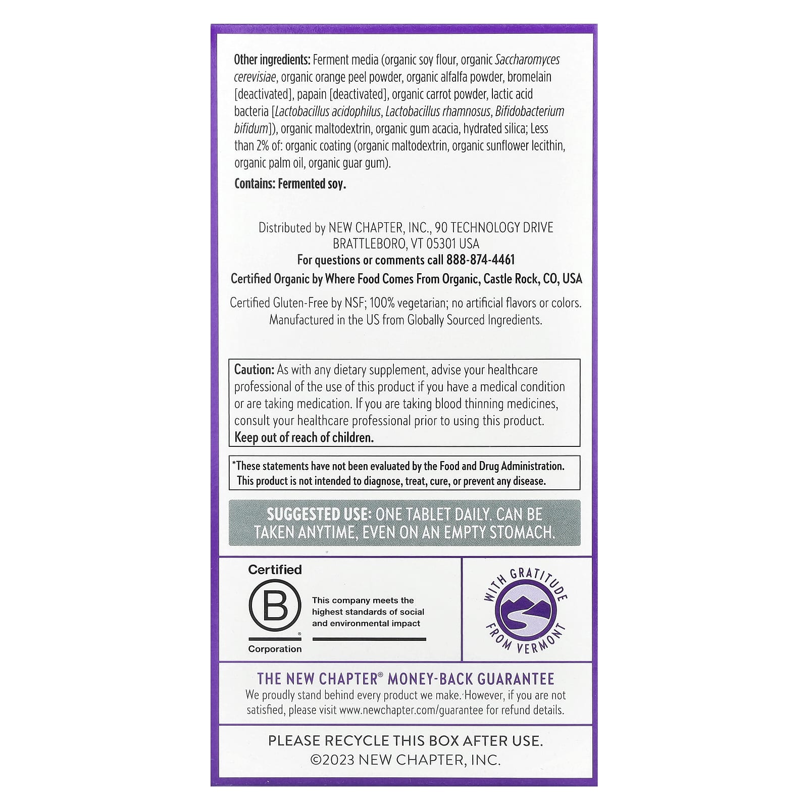 Ферментированная среда (органическая соевая мука, органические пекарские дрожжи (Saccharomyces cerevisiae), органический порошок из цедры апельсина, органический порошок из люцерны, бромелаин [деактивированный], папаин [деактивированный], порошок из органической моркови, молочнокислые бактерии [ацидофильные лактобактерии (Lactobacillus acidophilus), лактобактерии рамнозус (Lactobacillus rhamnosus), бифидобактерии бифидум (Bifidobacterium bifidum)], органический мальтодекстрин, органическая аравийская камедь, гидратированный диоксид кремния; менее 2% таких ингредиентов: органическая оболочка (органический мальтодекстрин, органический подсолнечный лецитин, органическое пальмовое масло, органическая гуаровая камедь).