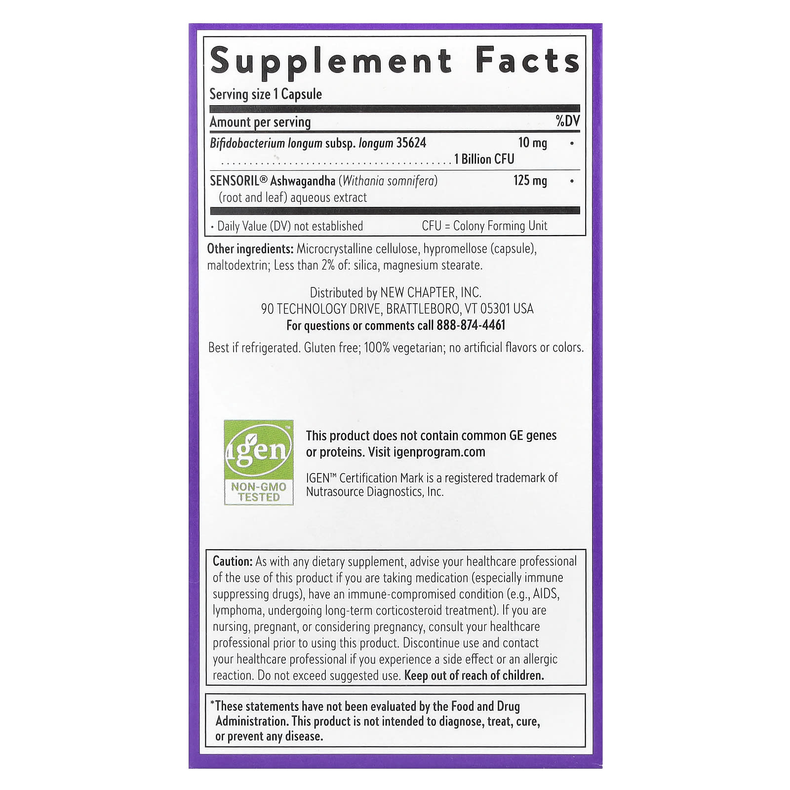 Содержит 1 миллиард КОЕ высококонцентрированного, научно обоснованного штамма, обладающего эффективностью до истечения срока годности. Пробиотики New Chapter® проходят тщательное тестирование и контроль качества, чтобы доставить эффективное количество, не требуя мегабиллионов!