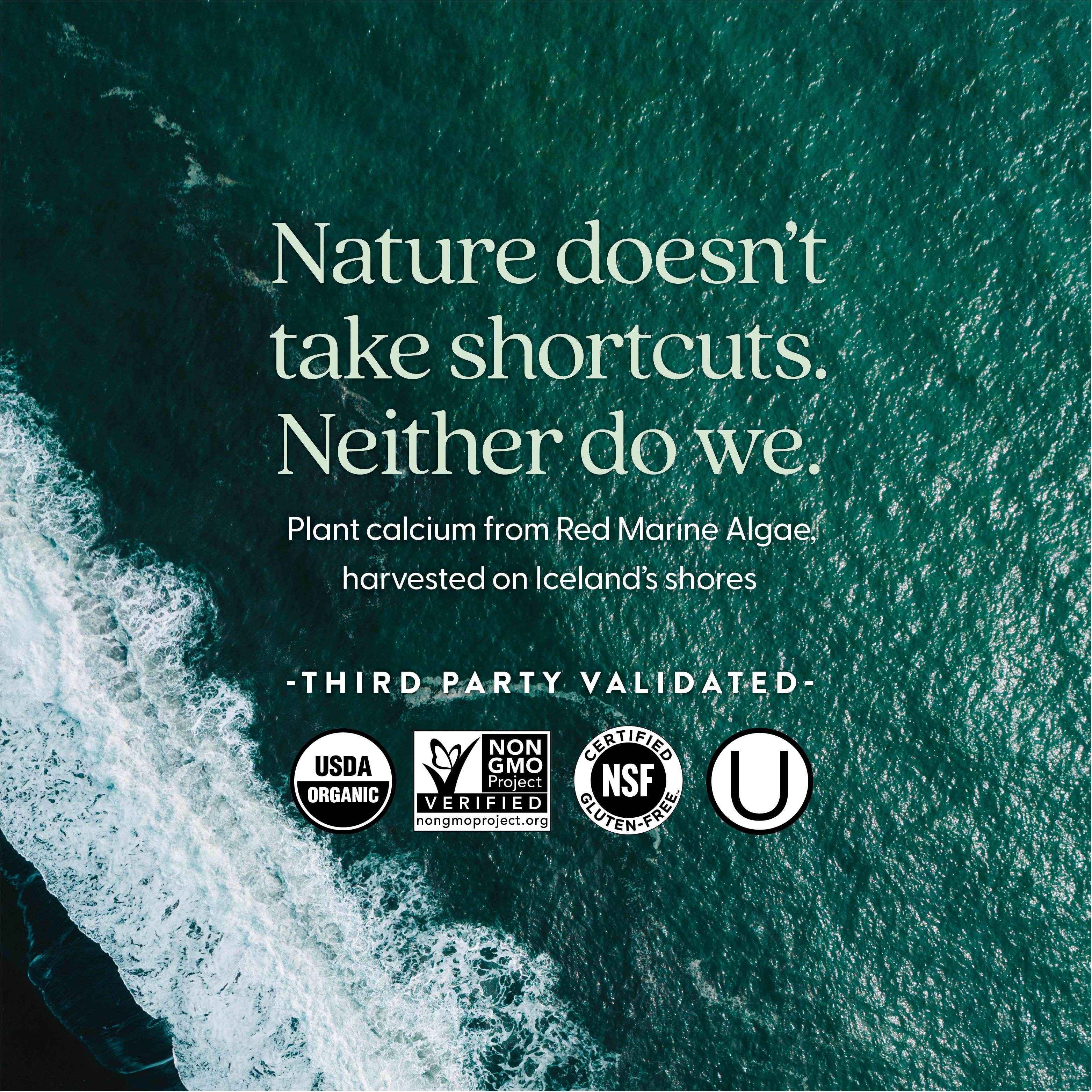 В отличие от кальция, полученного из известковых пород, в котором нет других полезных для костей питательных веществ, наш растительный кальций изготовлен из диких красных морских водорослей (литотамний), цельнопищевого источника, содержащего более 70 минералов для целостного питания костей. Выращенные экологичным способом растения с побережья Исландии.