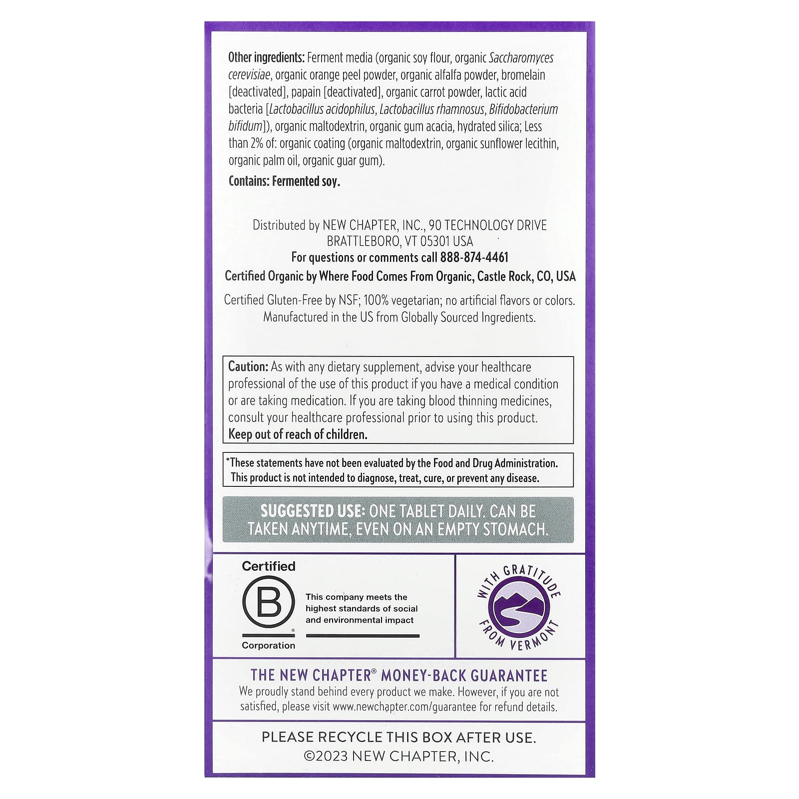 Ферментированная среда (органическая соевая мука, органические пекарские дрожжи (Saccharomyces cerevisiae), органический порошок из цедры апельсина, органический порошок из люцерны, бромелаин [деактивированный], папаин [деактивированный], органический порошок из моркови и молочнокислые бактерии [ацидофильные лактобактерии (Lactobacillus acidophilus), лактобактерии рамнозус [Lactobacillus rhamnosus] и бифидобактерии бифидум [Bifidobacterium bifidum]), органическая оболочка / связывающее вещество (органический мальтодекстрин, органическая аравийская камедь, органический подсолнечный лецитин, органическое пальмовое масло и органическая гуаровая камедь), смесь органической клетчатки (органическая рисовая мука, органическая овсяная клетчатка органический лецитин подсолнечника), диоксид кремния, альгинат натрия, гороховый крахмал и органическая аравийская камедь.