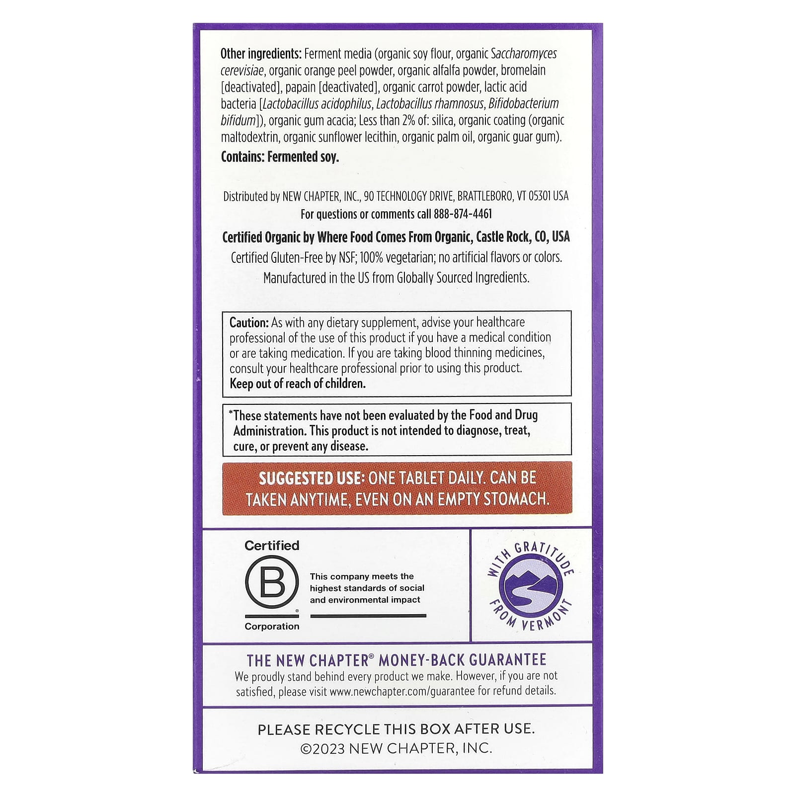 Ферментированная среда (органическая соевая мука, органические пекарские дрожжи (Saccharomyces cerevisiae), органический порошок из цедры апельсина, органический порошок из люцерны, бромелаин [деактивированный], папаин [деактивированный], органический порошок из моркови, молочнокислые бактерии [лактобактерии ацидофилус (Lactobacillus acidophilus), лактобактерии рамнозус, бифидобактерии бифидум]), органическая акация; Менее 2% диоксида кремния, органическое покрытие (органический мальтодекстрин, органический подсолнечный лецитин, органическое пальмовое масло, органическая гуаровая камедь).