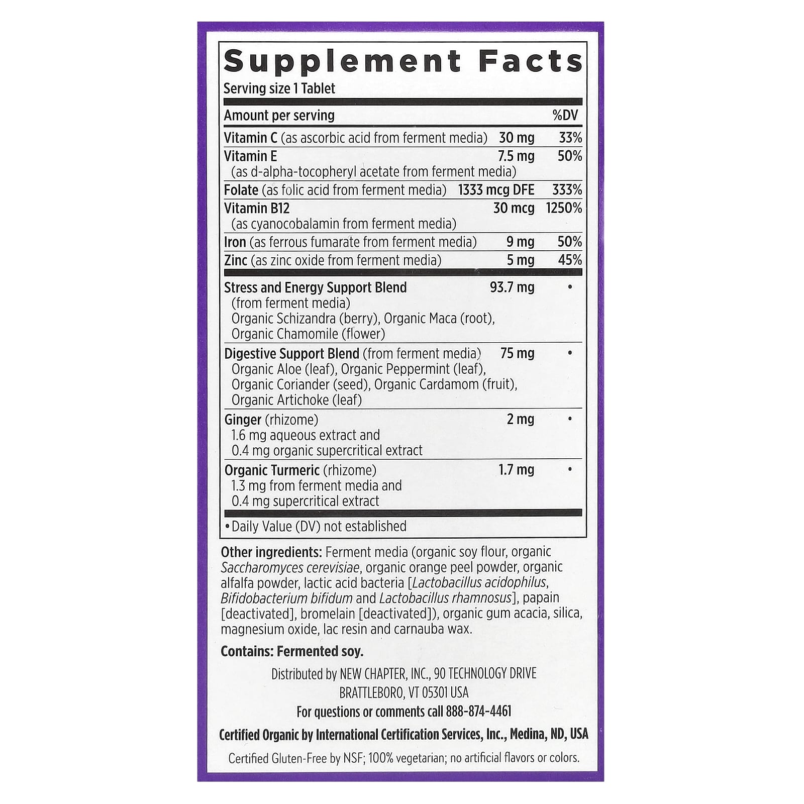 Ферментированная среда (органическая соевая мука, органические пекарские дрожжи (Saccharomyces cerevisiae), порошок из цедры органического апельсина, органический порошок из люцерны, молочнокислые бактерии (ацидофильные лактобактерии [Lactobacillus acidophilus]), бифидобактерии бифидум (Bifidobacterium bifidum) и лактобактерии рамнозус (Lactobacillus rhamnosus)], папаин [деактивированный], бромелаин [деактивированный]), органическая аравийская камедь, диоксид кремния, оксид магния, природная смола и карнаубский воск.