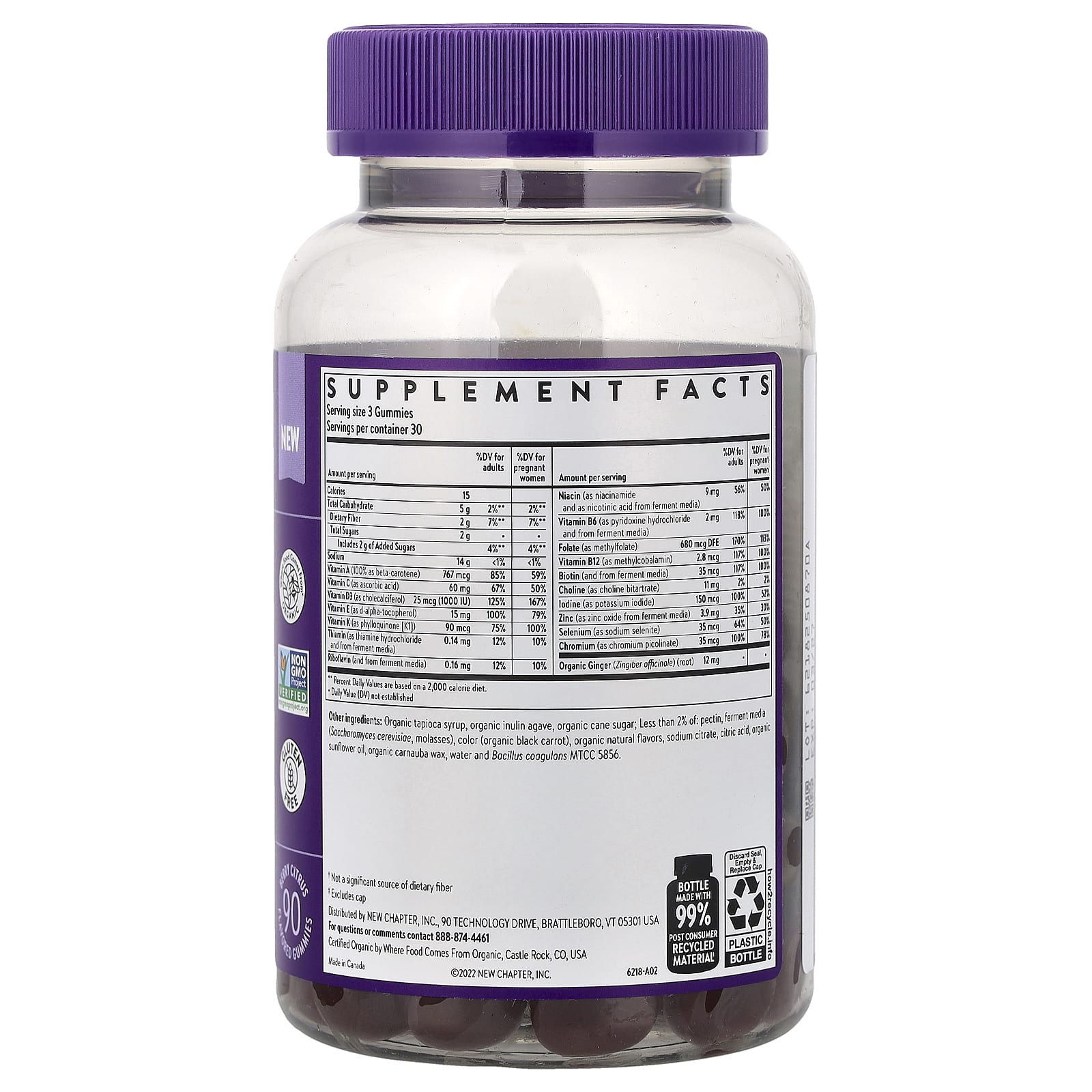 Органический тапиоковый сироп, органический инулин агавы, органический тростниковый сахар; Менее 2% пектина, ферментированные среды (Saccharomyces cerevisiae, патока), краситель (органическая черная морковь), органические натуральные ароматизаторы, цитрат натрия, лимонная кислота, органическое подсолнечное масло, органический карнаубский воск, вода и бацилла коагулянс (МТСС 5856).