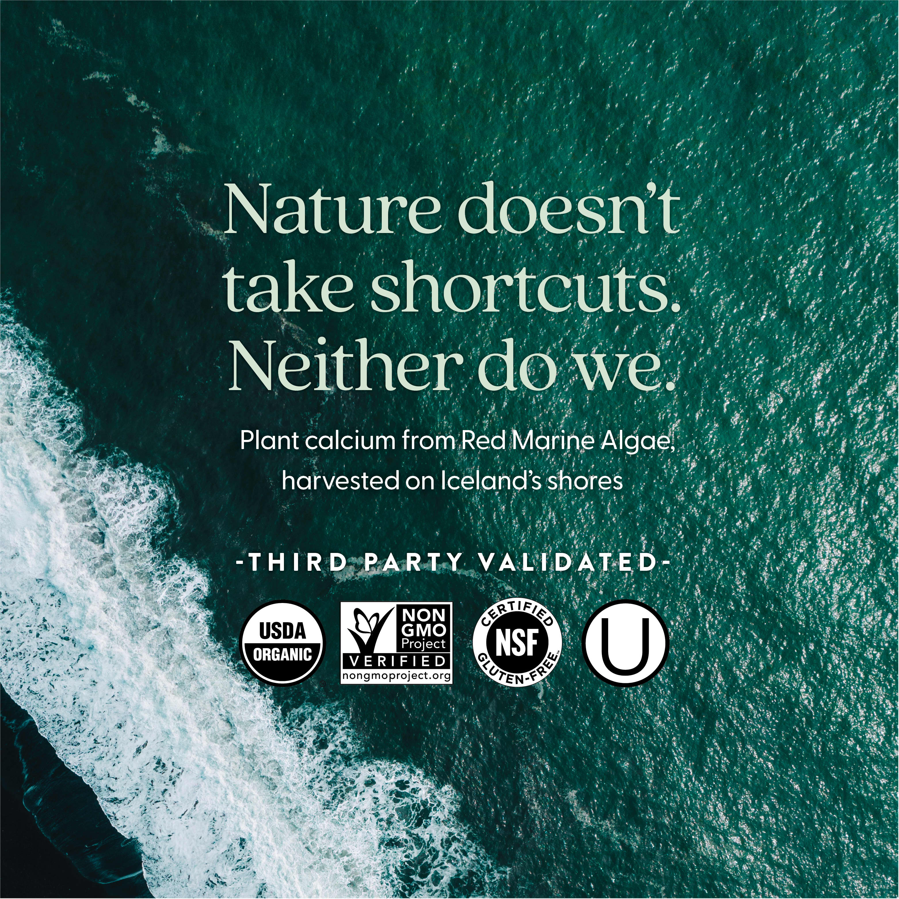 В отличие от кальция из известняка, в котором нет других питательных веществ, поддерживающих кости, наш органический растительный кальций получен из дикорастущих красных морских водорослей (Lithothamnion), цельного источника с более чем 70 минералами для комплексного питания костей. Его собирают экологичным способом на побережье Исландии.