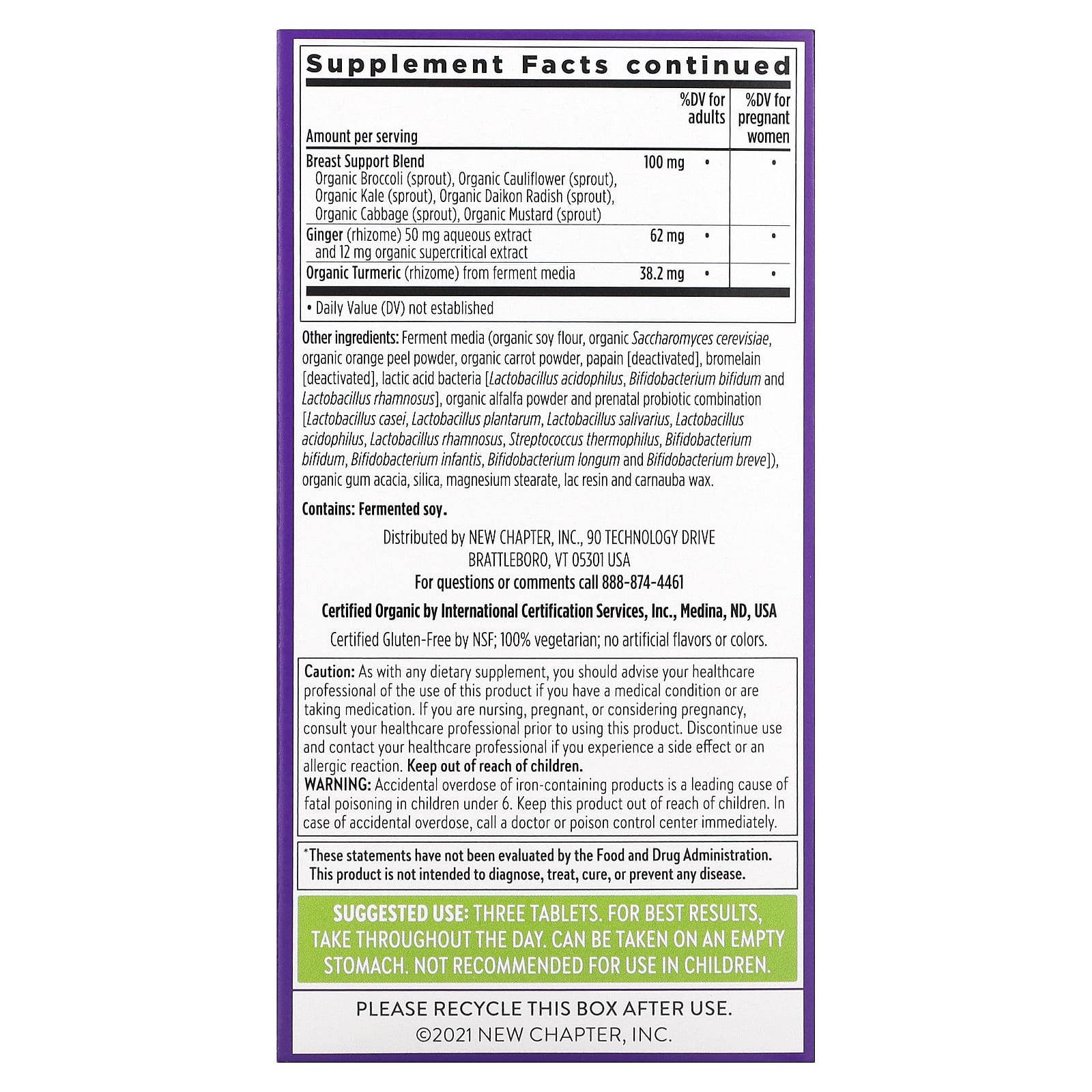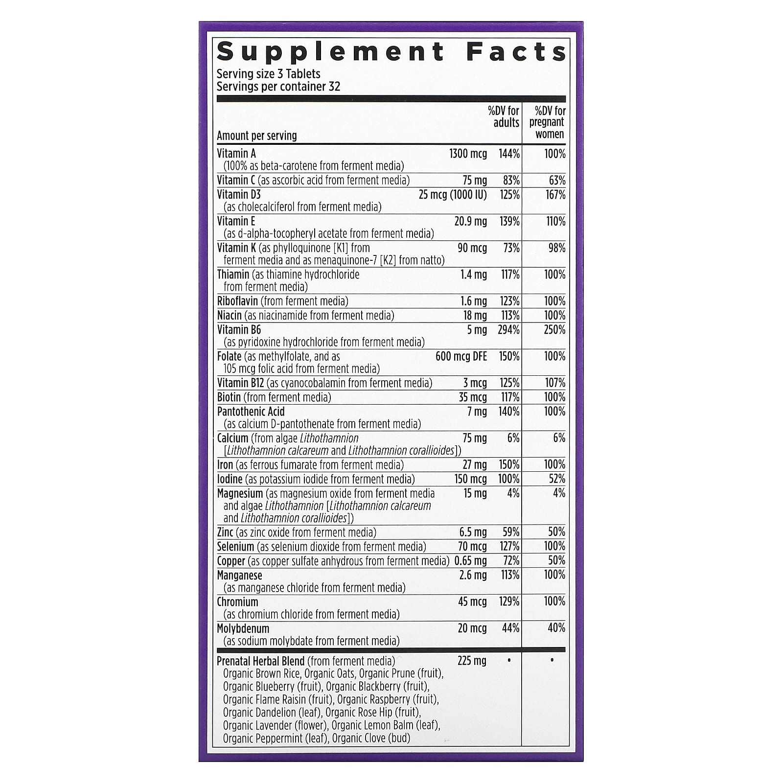 Ферментированная среда (органическая соевая мука, органические пекарские дрожжи (Saccharomyces cerevisiae), органический порошок из цедры апельсина, органический порошок из моркови, папаин [деактивированный], бромелаин [деактивированный], молочнокислые бактерии [лактобактерии ацидофилус (Lactobacillus acidophilus), бифидобактерия бифидум (Bifidobacterium bifidum) и лактобактерии рамнозус (Lactobacillus rhamnosus)], органический порошок из люцерны и комбинация пробиотиков для беременных [лактобактерия казеи (Lactobacillus casei), лактобактерия плантарум (Lactobacillus plantarum), лактобактерия саливариус (Lactobacillus salivarius), лактобактерии ацидофилус (Lactobacillus acidophilus), лактобактерия рамнозус (Lactobacillus rhamnosus), стрептококк термофильный (Streptococcus thermophilus), бифидобактерия бифидум (Bifidobacterium bifidum), бифидобактерия инфантис (Bifidobacterium infantis), бифидобактерии лонгум (Bifidobacterium longum) и бифидобактерия бреве (Bifidobacterium breve)], органическая аравийская камедь, диоксид кремния, стеарат магния, природная смола и карнаубский воск.