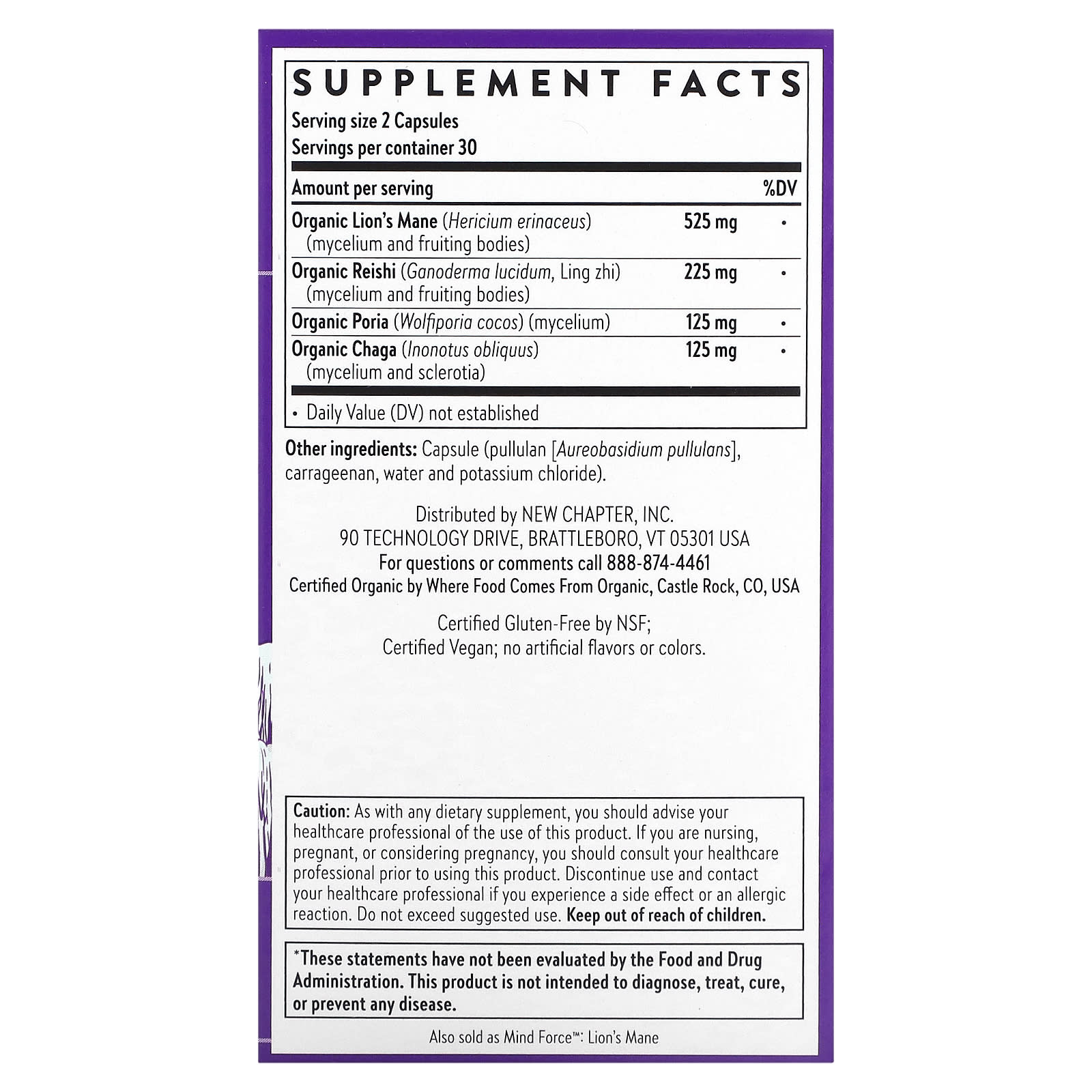 | Органическая львиная грива (Hericium erinaceus) (мицелий и плодовые тела) | 525 мг | * |