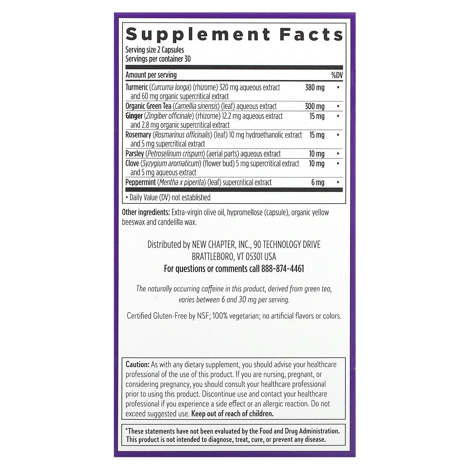 Кофеин природного происхождения, содержащийся в этом продукте, получено из зеленого чая, варьируется от 6 до 30 мг на порцию.