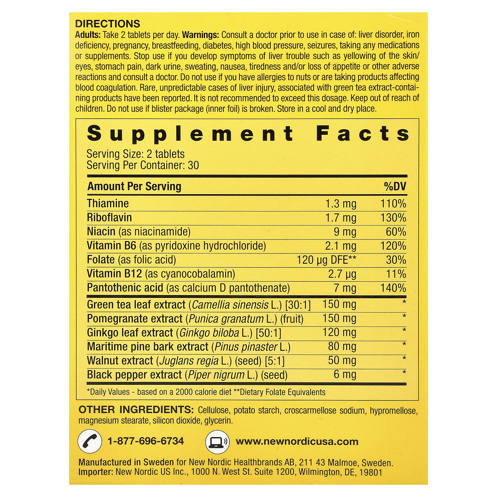 Проконсультируйтесь с врачом перед использованием в случае: заболевания печени, дефицит железа, беременность, грудное вскармливание, диабет, высокое артериальное давление, судороги, прием любых препаратов или добавок. Прекратите использование при появлении симптомов заболевания печени, таких как пожелтение кожи или глаз, боль в животе, темная моча, потливость, тошнота, усталость и/или потеря аппетита или другие побочные реакции, и обратитесь к врачу. Не следует использовать данный продукт, если у вас аллергия на орехи или вы принимаете продукты, влияющие на свертываемость крови. Сообщалось о редких и непредсказуемых случаях повреждения печени, связанного с продуктами, содержащими экстракт зеленого чая. Не следует превышать рекомендуемую дозировку. Хранить в недоступном для детей месте. Не используйте, если блистерная упаковка (внутренняя фольга) повреждена. Хранить в прохладном и сухом месте.