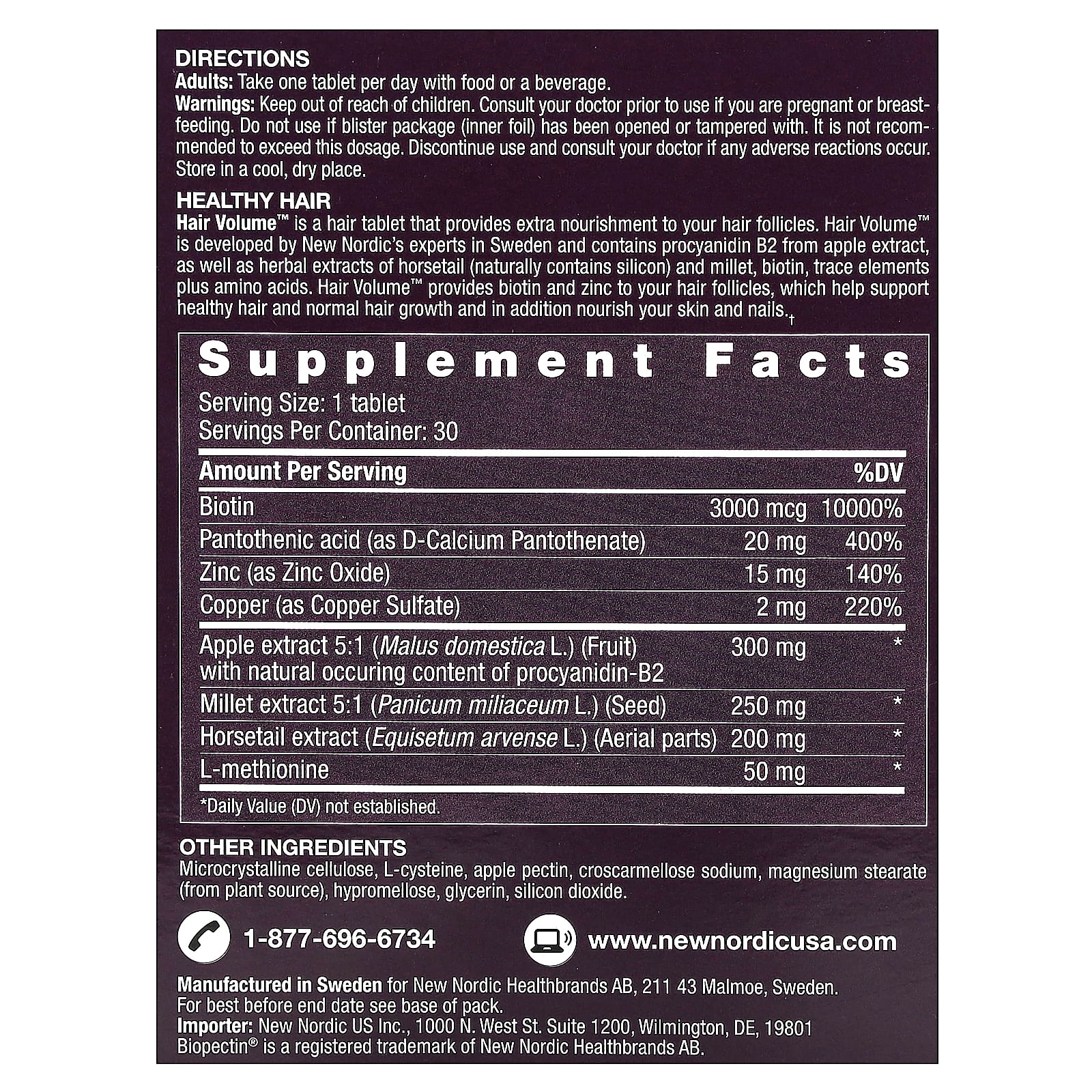 Hair Volume™ — это таблетка для волос, которая обеспечивает дополнительное питание волосяным фолликулам. Hair Volume™ разработан экспертами New Nordic в Швеции и содержит процианидин B2 из экстракта яблока, а также экстракты трав хвоща и проса, биотин, микроэлементы и аминокислоты. Hair Volume™ снабжает волосяные фолликулы биотином и цинком, которые помогают поддерживать здоровье волосы и их нормальный рост, а также питают кожу и ногти.
