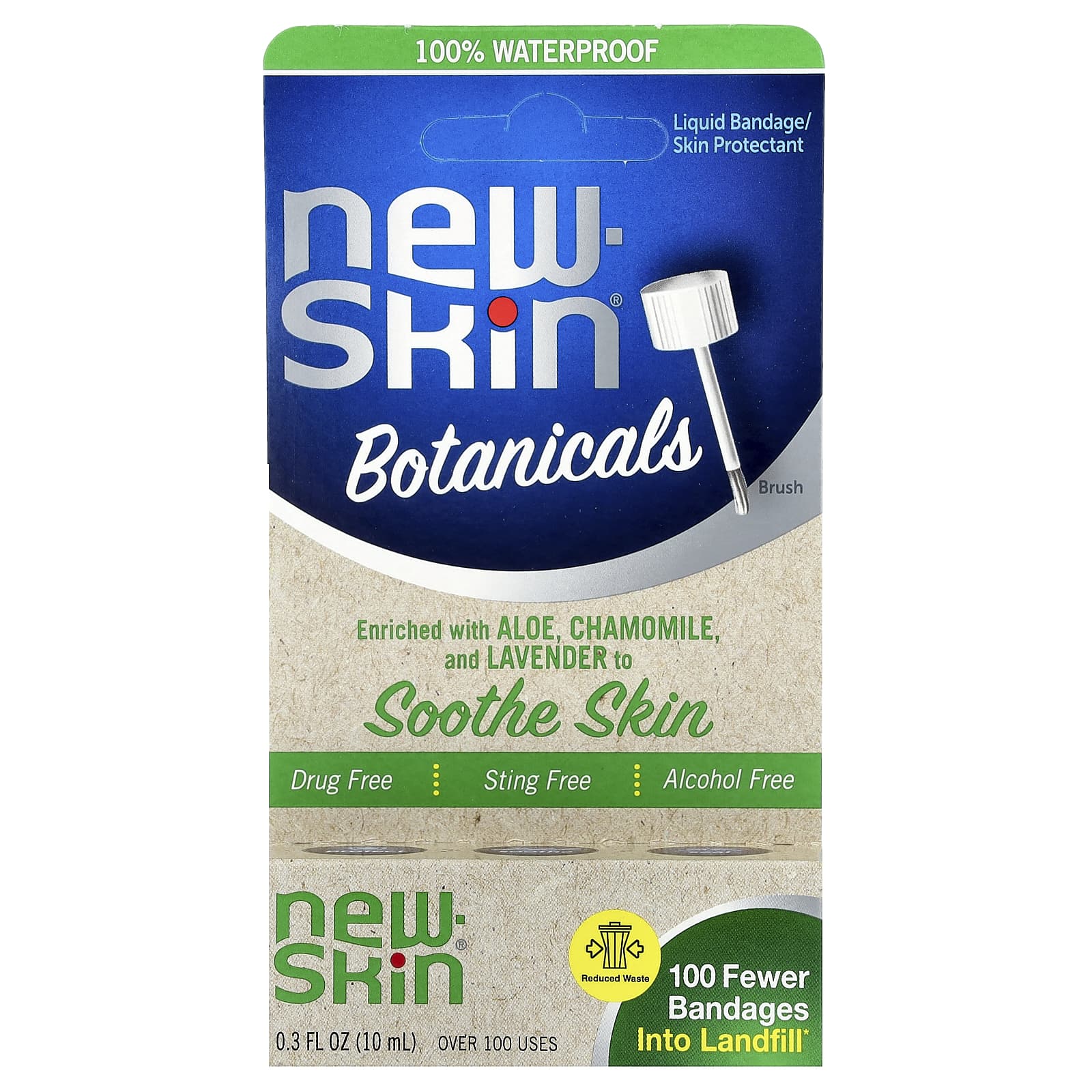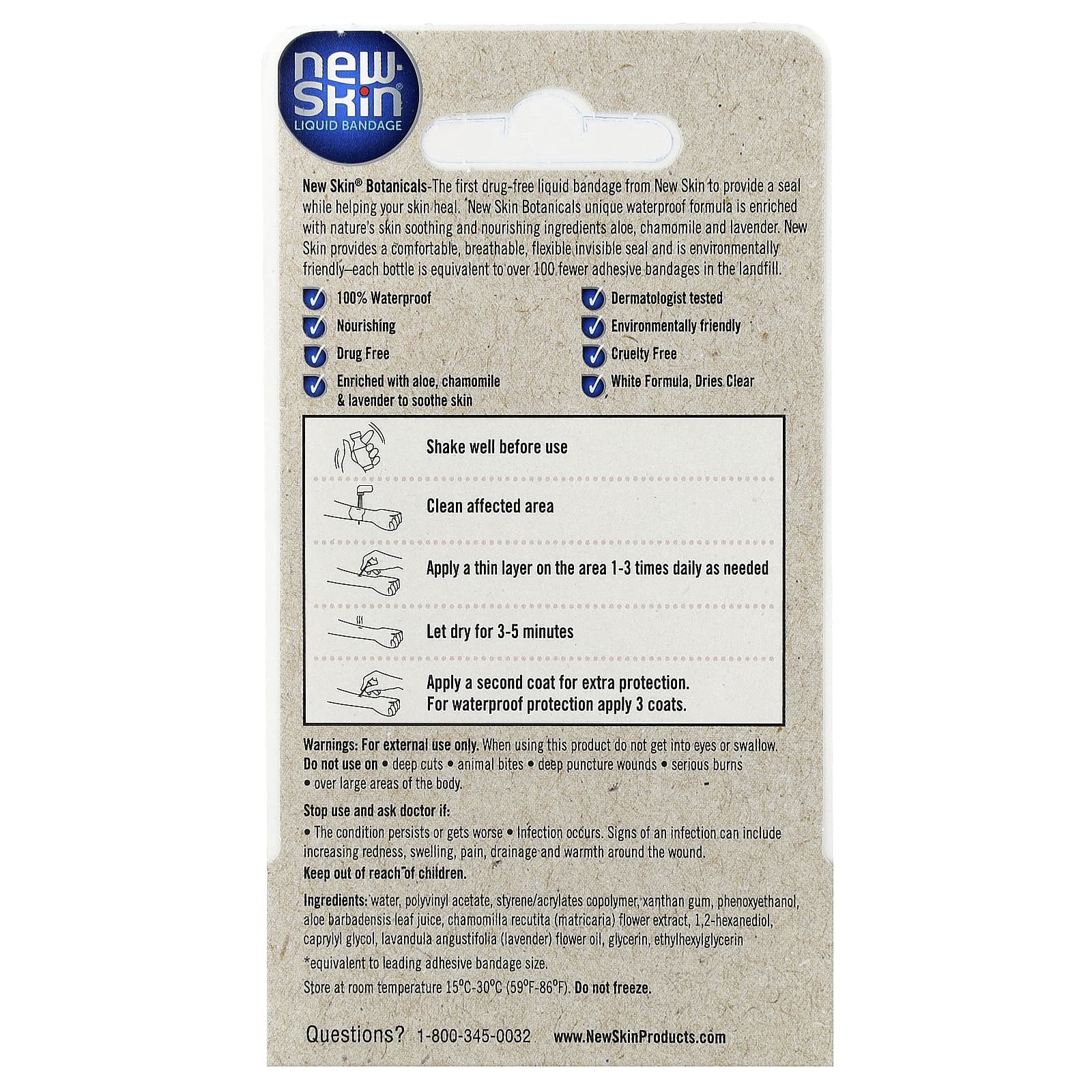 Botanicals от New Skin® - первый жидкий пластырь от New Skin, не содержащий наркотических веществ, который обеспечивает герметичность и способствует заживлению кожи. Уникальная водостойкая формула от New Skin Botanicals обогащена натуральными успокаивающими и питательными для кожи ингредиентами: алоэ, ромашкой и лавандой. New Skin обеспечивает удобную, дышащую и гибкую невидимую защитную пленку, а также не вредит окружающей среде: каждый флакон эквивалентен более чем 100 пластырям, выбрасываемым на свалке.