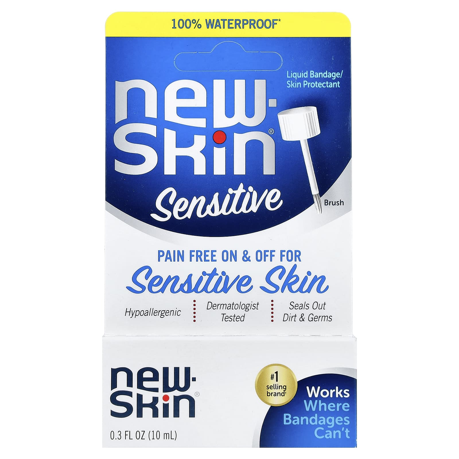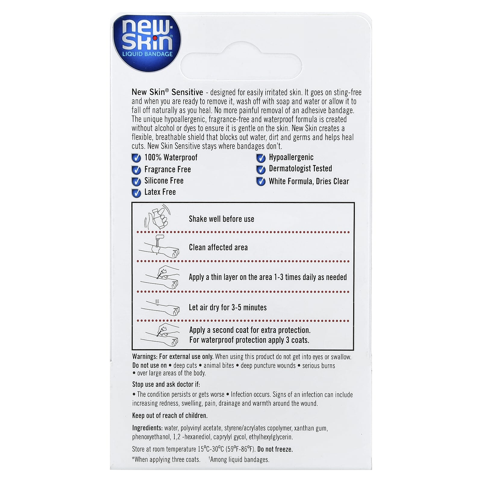 Средство для чувствительной кожи New Skin® предназначено для кожи, которая легко раздражается. На месте не возникает покалывания. Когда вы будете готовы к использованию, смойте водой с мылом или дайте волосам естественным образом отклеиться по мере заживления. Больше нет болезненного снятия лейкопластыря. Уникальная гипоаллергенная водостойкая формула без отдушек не содержит спирта и красителей, что обеспечивает мягкое воздействие на кожу. New Skin создает гибкий дышащий слой, который не пропускает воду, грязь и микробы, а также помогает заживлять порезы. Для чувствительной кожи New Skin помогает повязка.