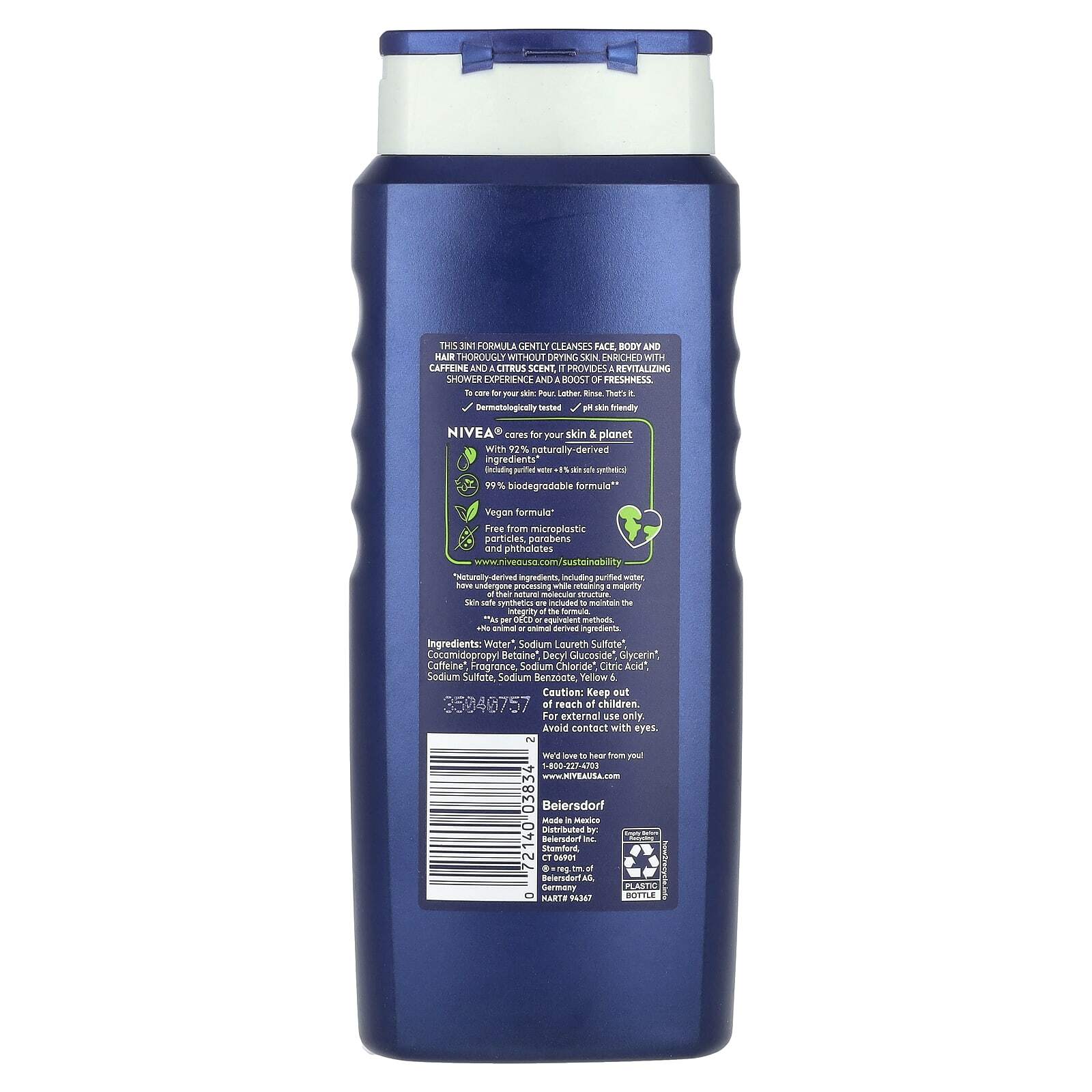 Формула 3в1 нежно очищает лицо, тело и волосы, не сушит кожу. Обогащенный кофеином и цитрусовым ароматом, он обеспечивает бодрящий эффект под душем и придает ощущение свежести.