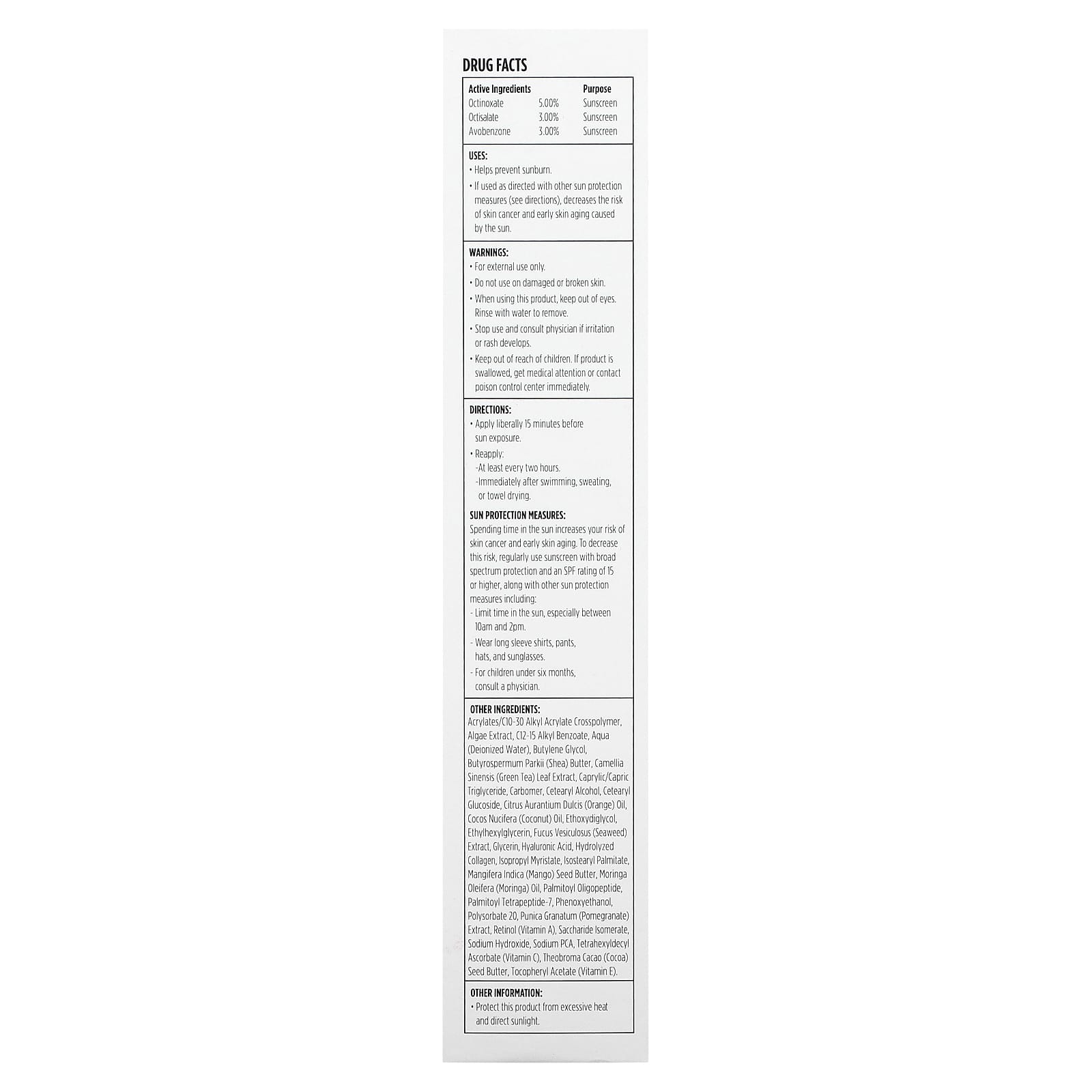акрилат/c10-30 алкил акрилат кроссполимер, экстракт водорослей, c12-15 алкил бензоат, вода (деионизированная вода), бутиленгликоль, масло ши (Butyrospermum parkii), экстракт листьев зеленого чая (Camellia sinensis), каприловый/каприновый триглицерид, карбомер, цетеариловый спирт, цетеариловый глюкозид, масло апельсина (Citrus aurantium dulcis), кокосовое масло (Cocos nucifera), этоксидигликоль, этилгексилглицерин, экстракт морских водорослей (Fucus vesiculosus), глицерин, гиалуроновая кислота, гидролизованный коллаген, изопропил миристат, изостеарил пальмитат, масло из косточек манго (Mangifera indica), масло моринги (Moringa oleifera), пальмитоил олигопептид, пальмитоил тетрапептид-7, феноксиэтанол, полисорбат 20, экстракт граната (Punica granatum), ретинол (витамин A), инвертный сахар, гидроксид натрия, натрия пирролидонкарбонат, тетрагексилдецил аскорбат (витамин C), масло из зерен какао (Theobroma cacao), токоферилацетат (витамин E).
