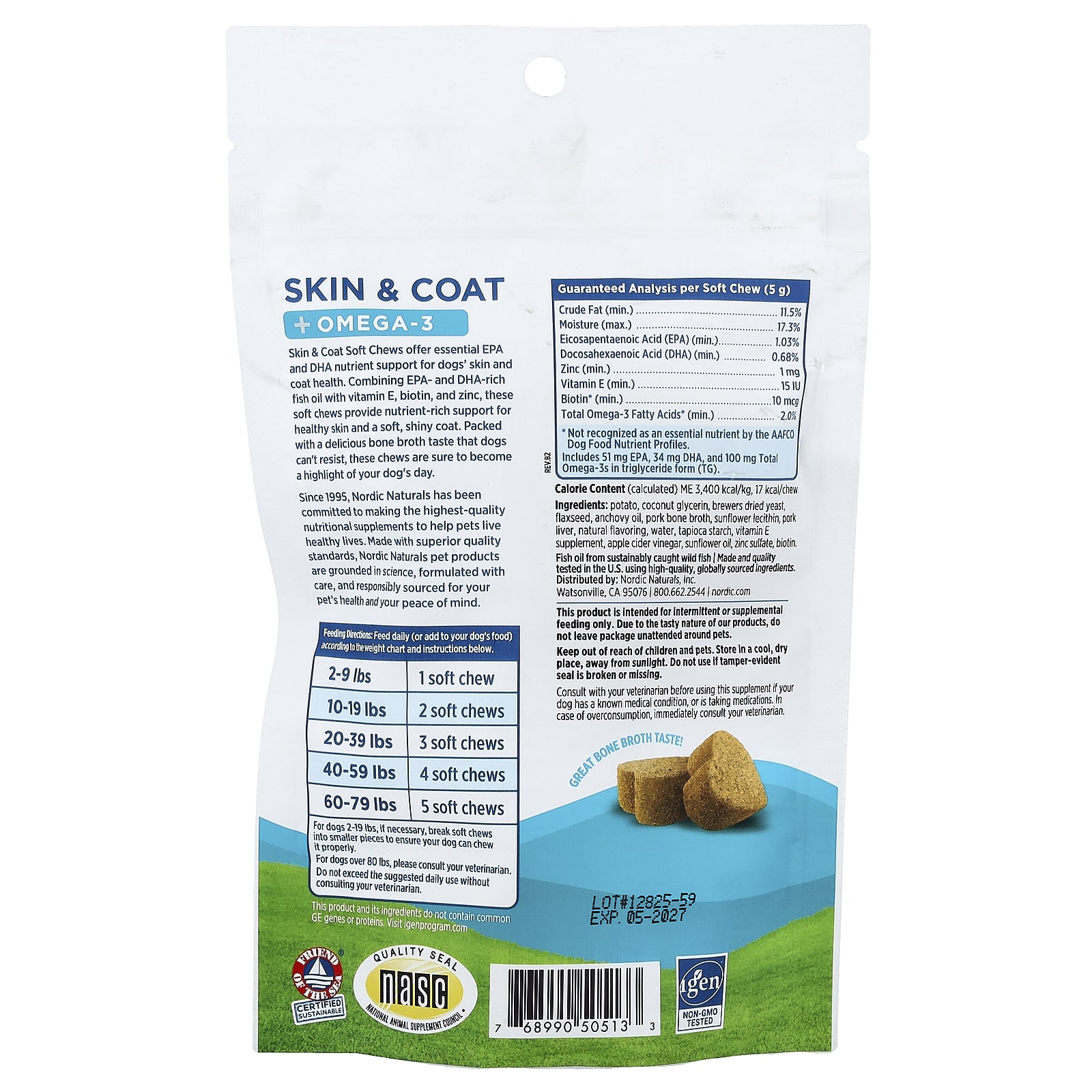 Жевательные таблетки для кожи и шерсти содержат необходимые питательные вещества ЭПК и ДГК для здоровья кожи и шерсти собак. Эти мягкие жевательные таблетки, сочетающие богатый ЭПК и ДГК рыбий жир с витамином Е, биотином и цинком, обеспечивают богатую питательными веществами поддержку для здоровья кожи и мягкой и блестящей шерсти. Эти жевательные таблетки с восхитительным вкусом костного бульона, перед которым собаки не могут устоять, обязательно станут изюминкой дня вашей собаки.