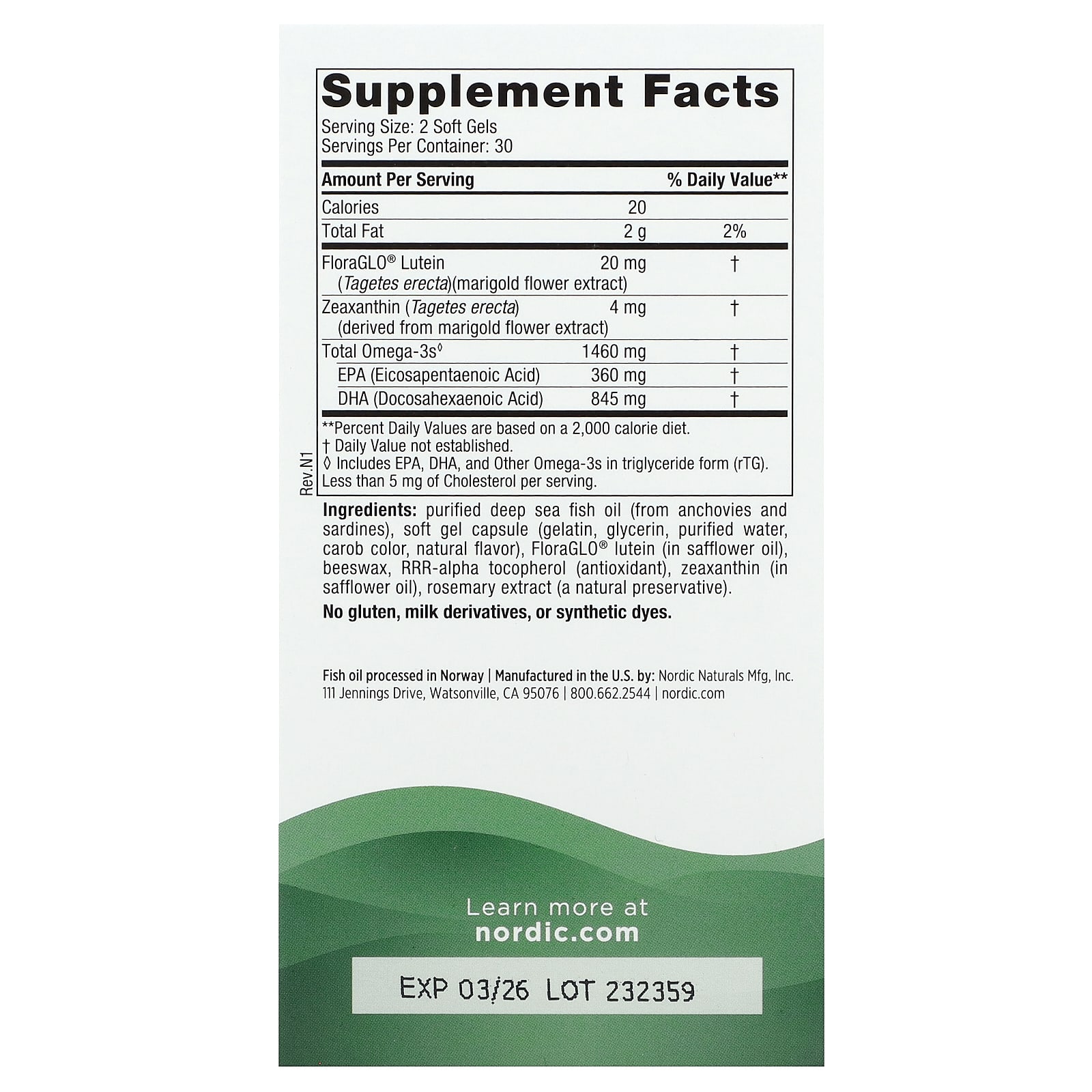 Очищенный жир глубоководных рыб (анчоусов и сардин), желатиновая капсула (желатин, глицерин, очищенная вода, краситель из рожкового дерева, натуральный ароматизатор), лютеин FloraGLO® (в сафлоровом масле), пчелиный воск, rrr-альфа-токоферол (антиоксидант), зеаксантин (в сафлоровом масле), экстракт розмарина (натуральный консервант).