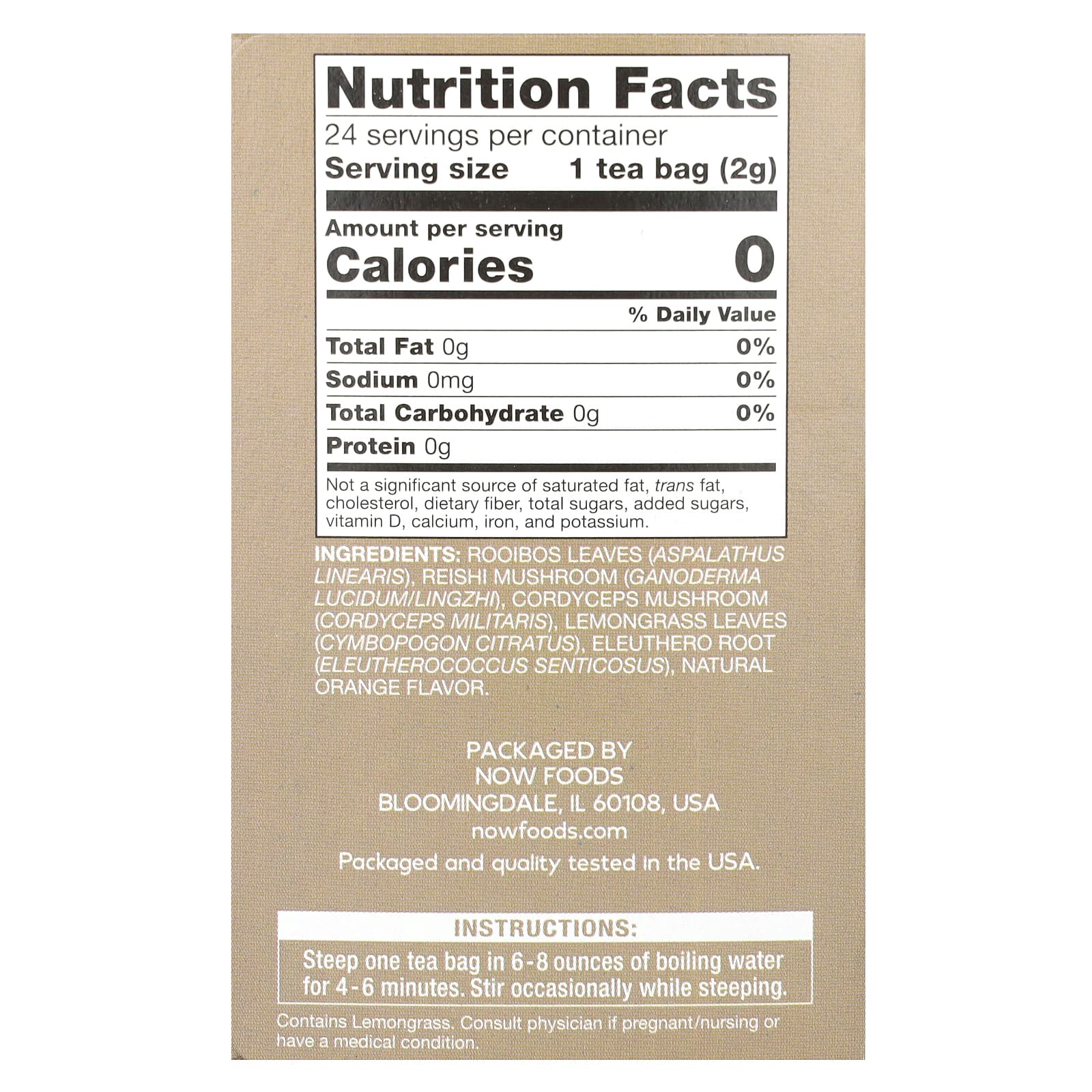 Листья ройбуша (Aspalathus linearis), гриб рейши (трутовик лакированный (Ganoderma lucidum)/линчжи, кордицепс, гриб кордицепс военный (Cordyceps militaris)), листья лемонграсса (Cymbopogon citratus), корень женьшеня (Eleutherococcus senticosus), натуральный ароматизатор.