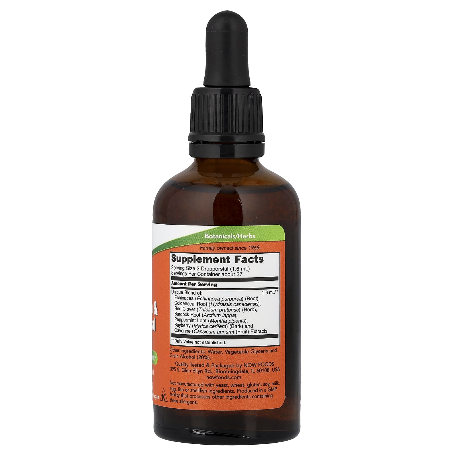 | Уникальная смесь Эхинацея (Echinacea purpurea) (корень), корень желтокорня (Hydrastis canadensis), красный клевер (Trifolium pratense) (трава), корень лопуха (Arctium lappa), листья перечной мяты (Mentha piperita), кора лаванды (Myrica cerifera) и кайенский перец экстракты плодов (Capsicum annum) | 1,6 мл | ** |