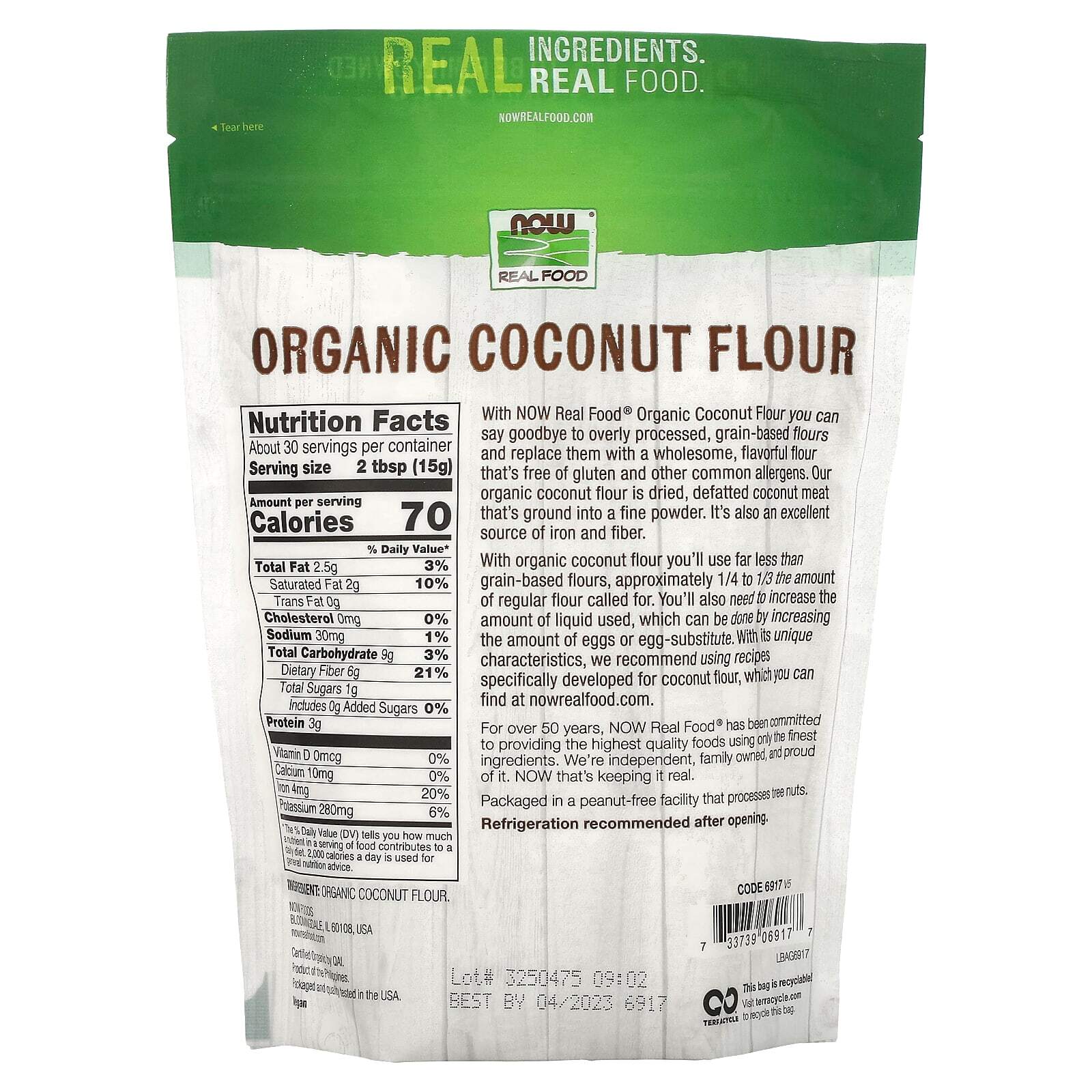 Благодаря органической кокосовой муке Now Real Food вы можете попрощаться с переработанной зерновой мукой и заменить ее полезной, здоровой, ароматной мукой, не содержащей глютена и других распространенных аллергенов. Наша органическая кокосовая мука - это высушенная, обезжиренная кокосовая мякоть, размолотая в мелкий порошок. Это также отличный источник клетчатки.