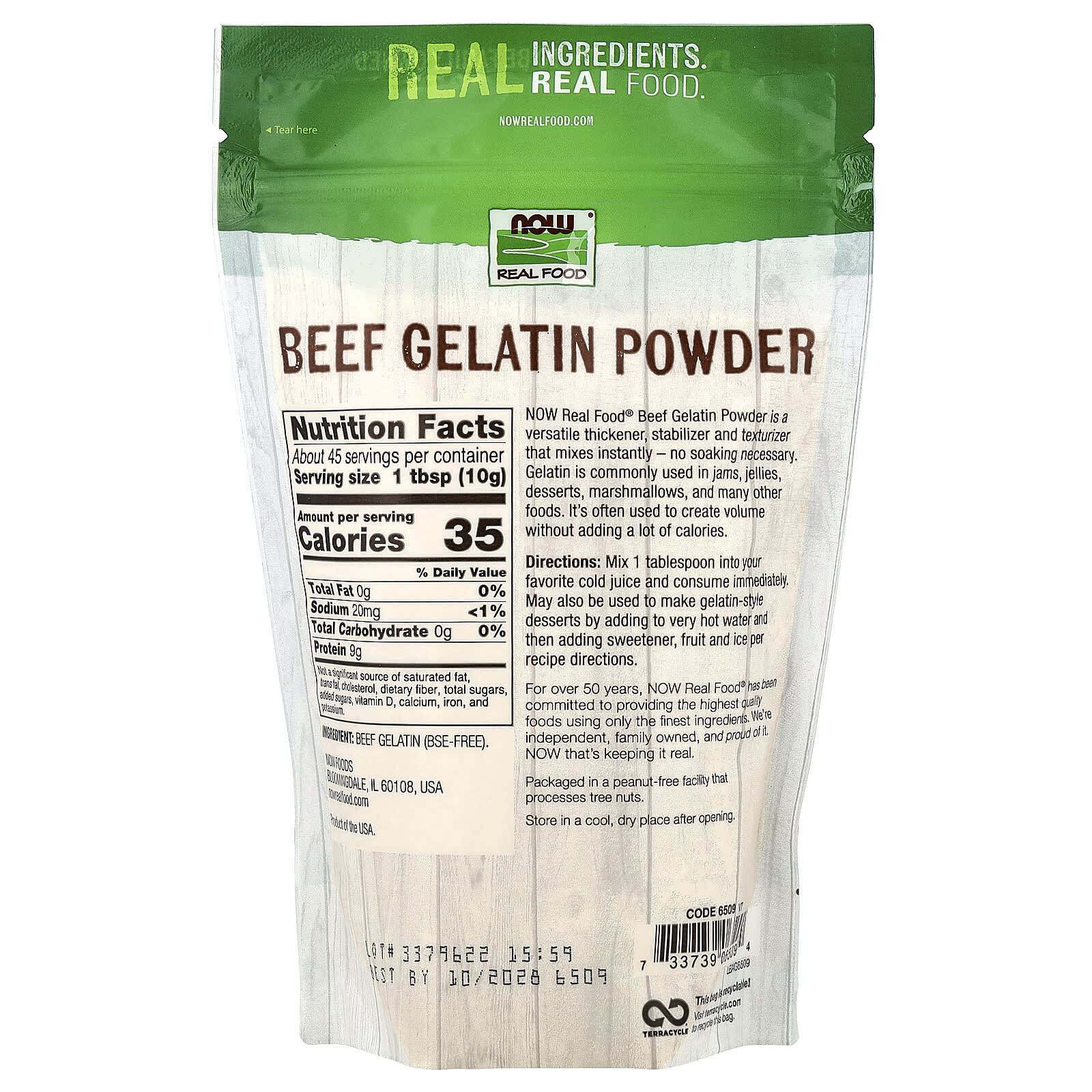 Говяжий желатин в порошке от NOW Real Food® — это универсальный загуститель и стабилизатор, который придает блюдам текстуру и мгновенно смешивается без замачивания. Желатин обычно используется в джемах, желе, десертах, зефире и многих других блюдах. Его часто используют для увеличения объема без добавления большого количества калорий.