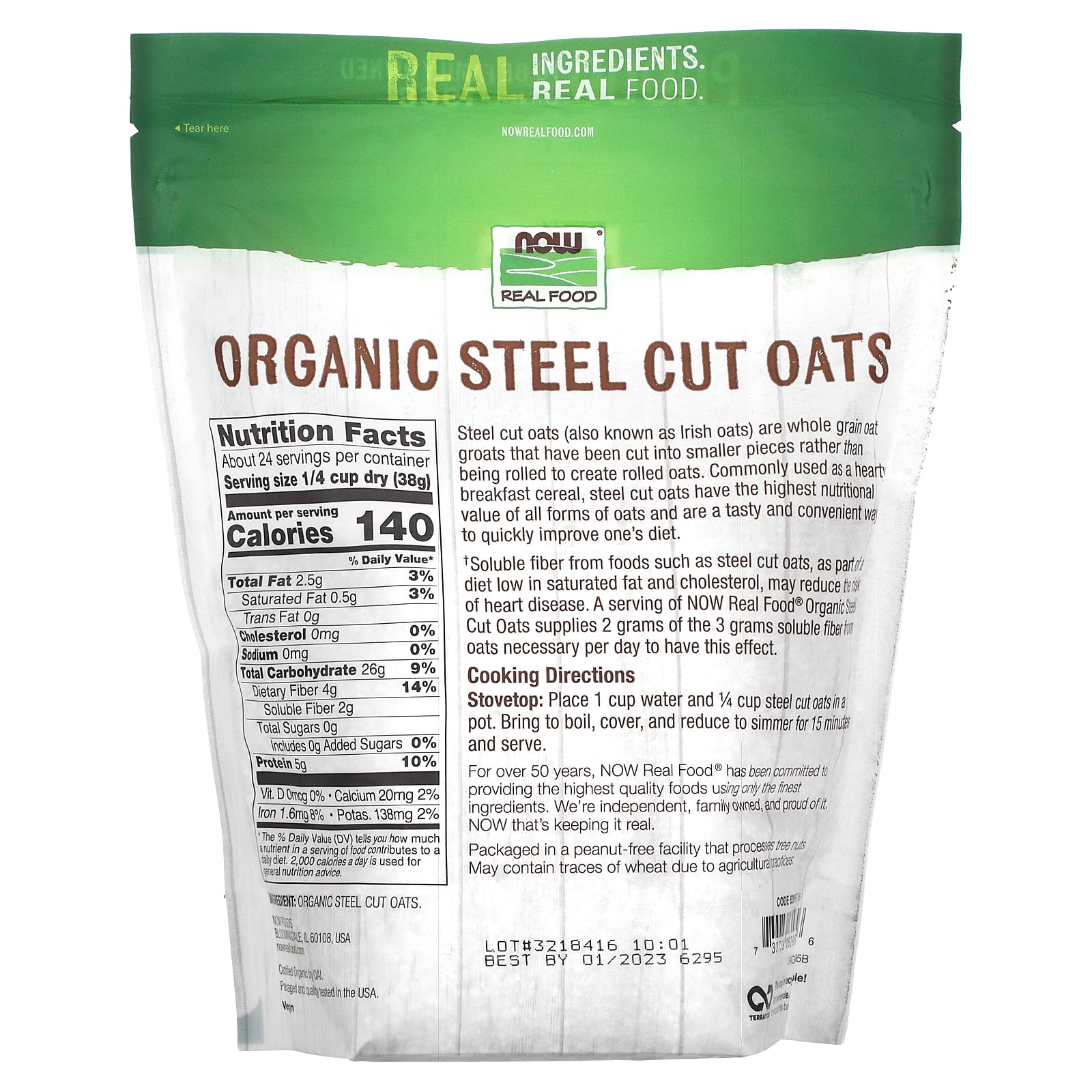 † Растворимая клетчатка из таких продуктов, как овсяные хлопья, при соблюдении диеты с низким содержанием насыщенных жиров и холестерина может снизить риск сердечных заболеваний. Порция овсяных хлопьев из органической стали от NOW Real Food® содержит 2 грамма из 3 граммов растворимой клетчатки в овсяных хлопьях, необходимых в день для достижения этого эффекта.