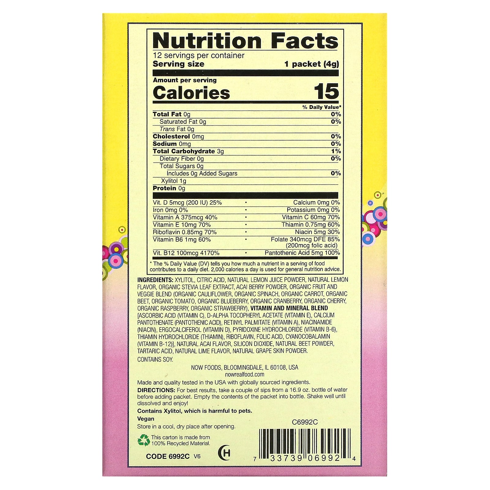 Ксилитол, лимонная кислота, порошок из натурального лимонного сока, натуральный ароматизатор «Лимон», органический экстракт листьев стевии, порошок из ягод асаи, смесь органических фруктов и овощей (органическая цветная капуста, органический шпинат, органическая морковь, органическая свекла, органический томат, органическая голубика, органическая клюква, органическая вишня, органическая малина, органическая клубника), смесь витаминов и минералов [аскорбиновая кислота (витамин C), d-альфа токоферилацетат (витамин E), пантотенат кальция (пантотеновая кислота), ретинилпальмитат (витамин A), ниацинамид (ниацин), эргокальциферол (витамин D), пиридоксина гидрохлорид (витамин B6), тиамина гидрохлорид (тиамин), рибофлавин, фолиевая кислота, цианокобаламин (витамин B12), натуральный ароматизатор «Асаи», диоксид кремния, натуральный порошок свеклы, винная кислота, натуральный ароматизатор «Лайм», натуральный порошок из кожицы винограда.