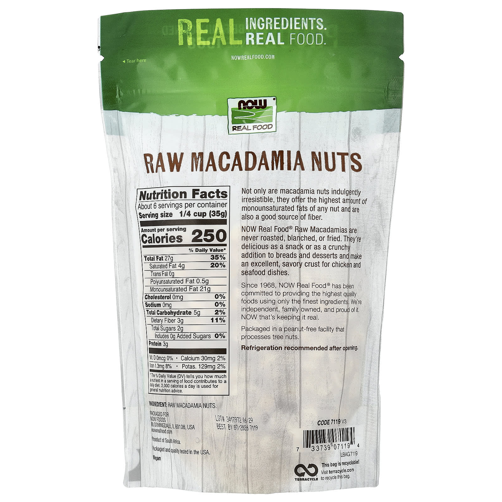 Необработанные макадамии от NOW Real Food® никогда не обжариваются, не бланшируются или не обжариваются. Они прекрасно подходят в качестве снека или хрустящей добавки к хлебу и десертам, а также являются отличной пикантной корочкой для блюд из курицы и морепродуктов.