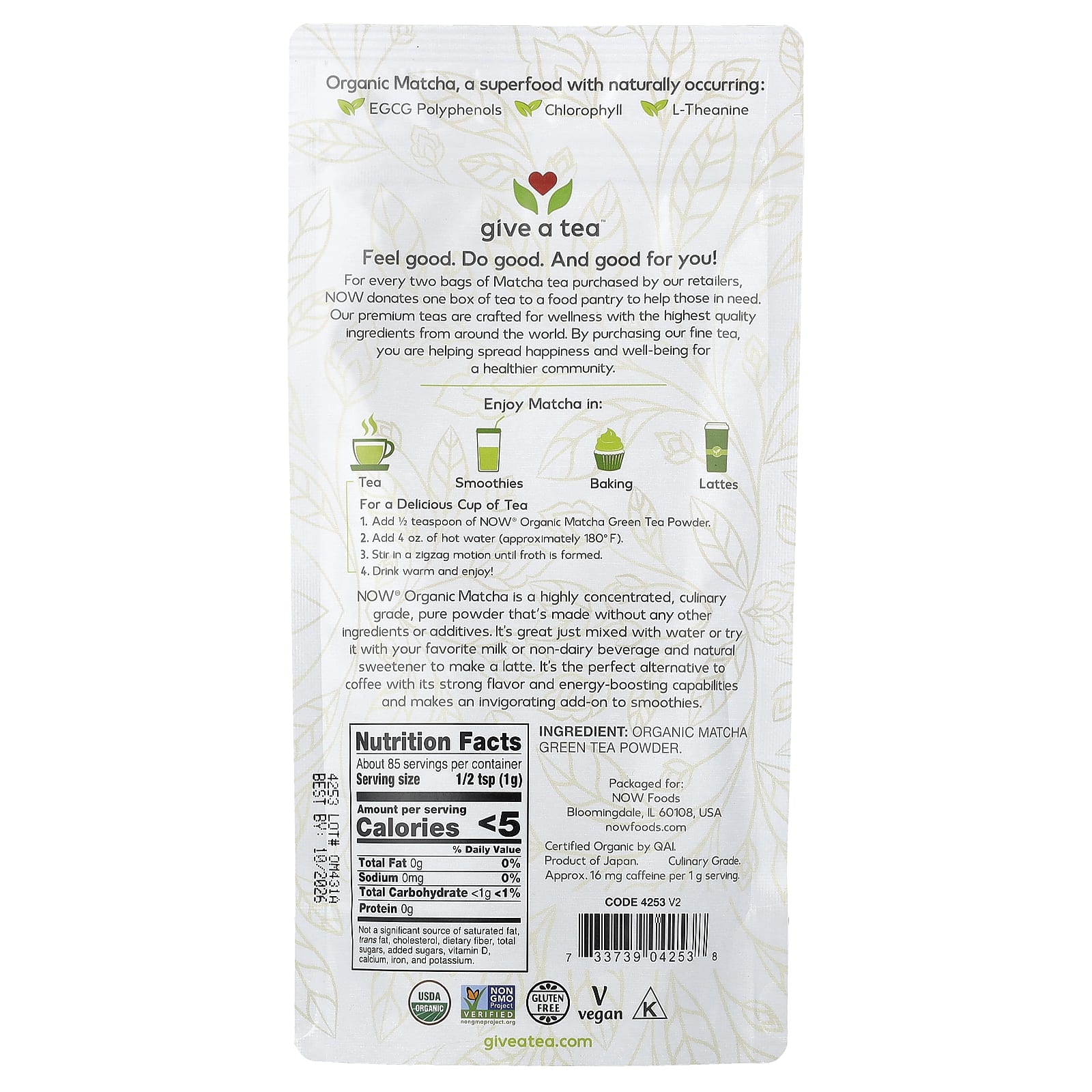 Из каждых двух пакетиков чая матча, приобретенных нашими розничными продавцами, NOW перечисляет одну упаковку чая на склад с продуктами, чтобы помочь тем, кто в этом нуждается. Наши премиальные чаи созданы для хорошего самочувствия из ингредиентов высочайшего качества со всего мира. Приобретая наш превосходный чай, вы помогаете другим людям стать более счастливыми и здоровыми.