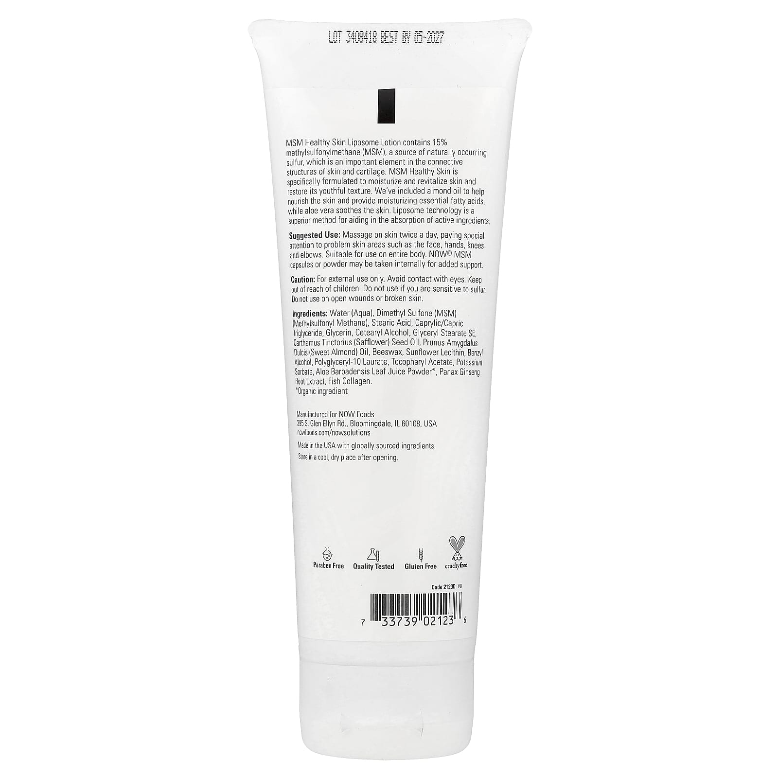 Наносите массажными движениями два раза в день, уделяя особое внимание проблемным участкам кожи, таким как лицо, руки, колени и локти. Подходит для применения на коже всего тела. NOW® MSM в капсулах или порошке можно принимать внутрь для дополнительной поддержки.