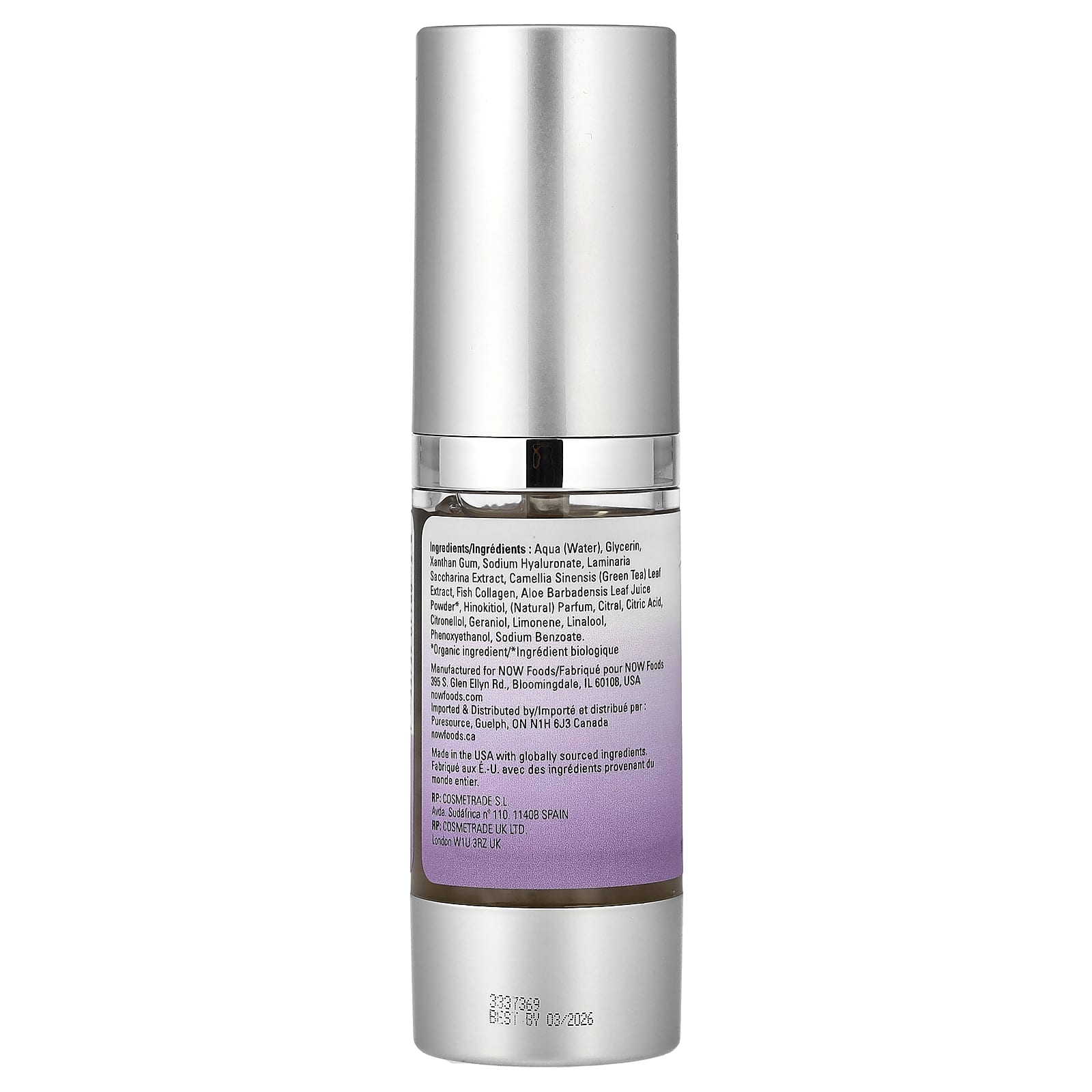 Вода, глицерин, ксантановая камедь, гиалуронат натрия, экстракт ламинарии сахаристой (Laminaria saccharina), экстракт листьев зеленого чая (Camellia sinensis), рыбий коллаген, порошок из сока листьев алоэ вера (Aloe barbadensis)*, хинокитиол, (натуральная) отдушка, цитраль, лимонная кислота, цитронеллола, гераниола, лимонен, линалоол, феноксиэтанол, бензоат натрия.