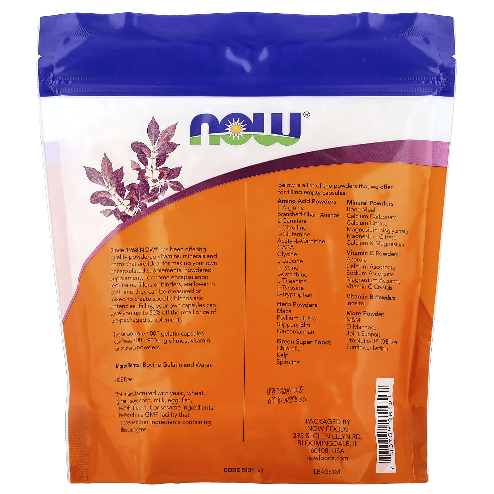 С 1968 года NOW® предлагает качественные витамины, минералы и травы в форме порошка, которые идеально подходят для приготовления собственных инкапсулированных добавок. Добавки в форме порошка для инкапсуляции в домашних условиях не содержат наполнителей или связывающих веществ, ниже по стоимости. Кроме того, их можно отмерять или смешивать для создания определенных смесей и уровней эффективности. Если вы самостоятельно наполняете капсулы, вы можете получить скидку до 50% от розничной цены расфасованных добавок.