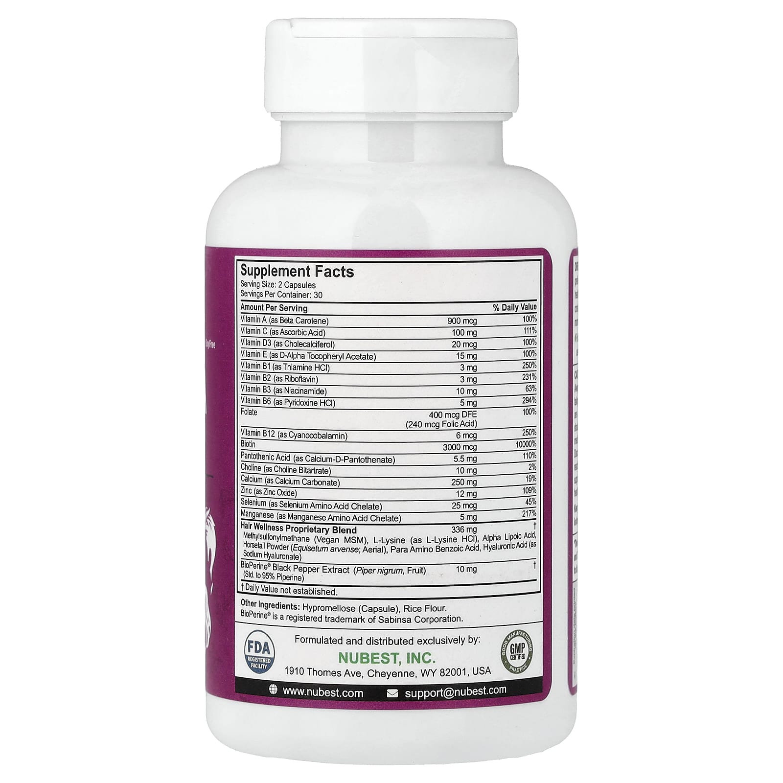 | Запатентованная смесь для здоровья волос Метилсульфонилметан (веганский МСМ), L-лизин (в виде L-лизина гидрохлорида), альфа-липоевая кислота, порошок хвоща полевого (Equisetum arvense; надземные части), парааминобензойная кислота, гиалуроновая кислота (в виде гиалуроната натрия) | 336 мг | † |