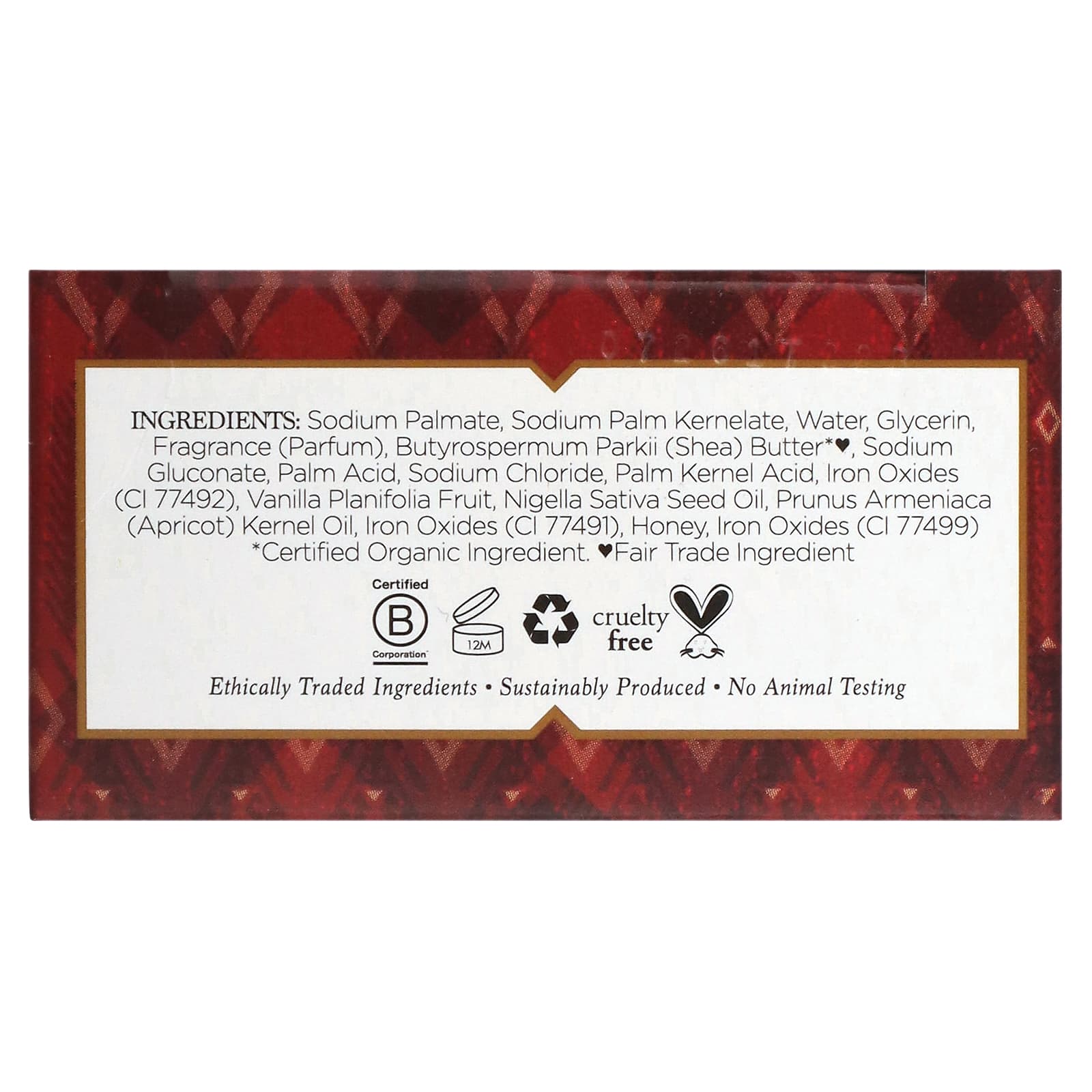Натрия пальмитат, пальмовый кернелат натрия, вода, глицерин, ароматизатор (отдушка), масло ши (butyrospermum parkii)*♥, глюконат натрия, пальмовая кислота, хлорид натрия, пальмоядровая кислота, оксиды железа (CI 77492), плоды ванили плосколистной (vanilla planifolia), масло семян черного тмина (nigella sativa), масло из абрикосовых косточек (prunus armeniaca), оксиды железа (CI 77491)*, мед, оксиды железа (CI 77499) * Сертифицированный органический ингредиент ♥ Ингредиент, закупаемый по принципам справедливой торговли