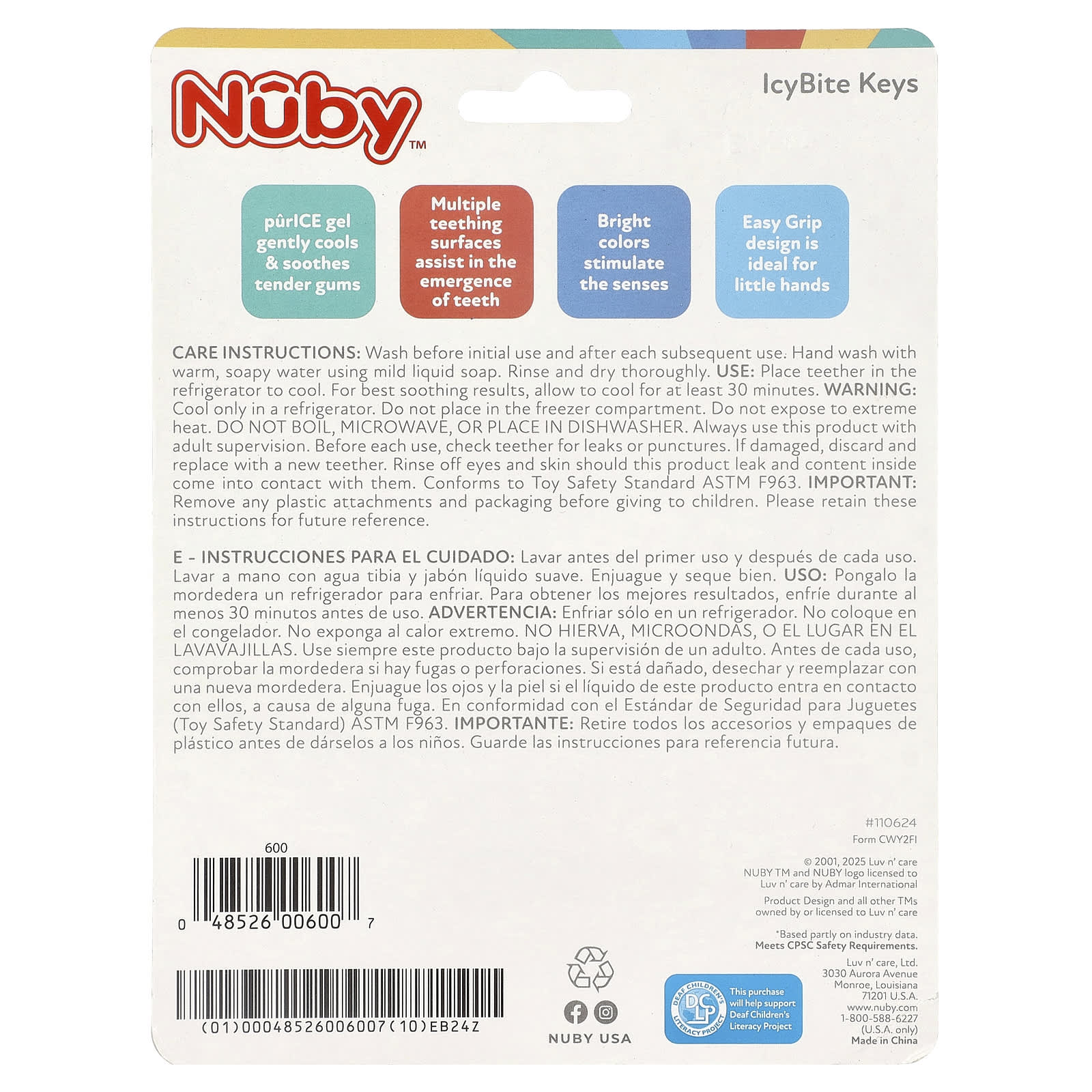 Остудить только в холодильнике. Не кладите в морозильную камеру. Беречь от воздействия высоких температур. Не кипятите, не кладите в микроволновую печь и не мыть в посудомоечной машине. Детям следует использовать этот продукт только под присмотром взрослых. Перед каждым использованием проверяйте прорезыватель на предмет протечек и проколов. В случае повреждения утилизируйте прорезыватель и замените его новым. При попадании продукта в глаза и попадание на кожу содержимого промойте их. Соответствует стандарту безопасности игрушек ASTM F963.