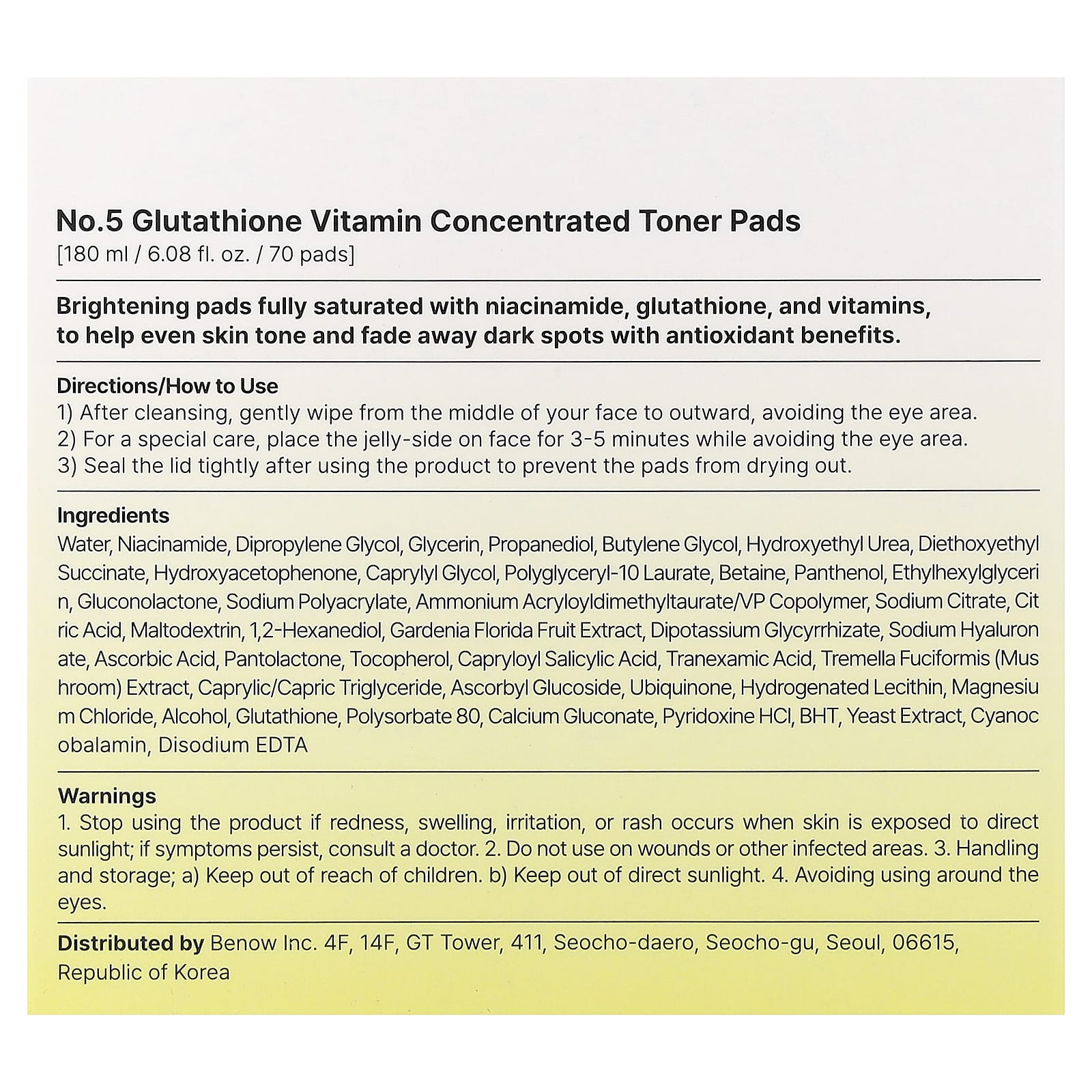 Вода, Ниацинамид, дипропиленгликоль, глицерин, пропандиол, бутиленгликоль, гидроксиэтилированная мочевина, диэтоксиэтил сукцинат, гидроксиацетофенон, каприлилгликоль, полиглицерил-10 лаурат, Бетаин, пантенол, этилгексилглицерин, Глюконолактон, полиакрилат натрия, аммоний акрилоилдиметилтаурат/ВП сополимер, цитрат натрия, лимонная кислота, мальтодекстрин, 1,2-гександиол, Экстракт плодов гардении флориды, глицирризат дикалия, гиалуронат натрия, аскорбиновая кислота, пантолактон, Токоферол, каприлоилсалициловая кислота, транексамовая кислота, экстракт снежного гриба (Tremella fuciformis), каприловый/каприновый триглицерид, аскорбил глюкозид, убихинон, Гидрогенизированный лецитин, хлорид магния, алкоголь, глутатион, полисорбат 80, глюконат кальция, пиридоксина гидрохлорид, Бат, экстракт дрожжей, цианокобаламин, Динатрий ЭДТА.