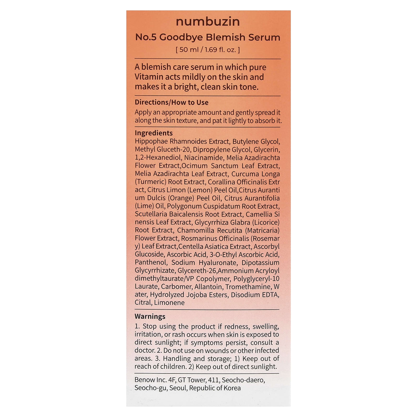 Экстракт облепихи рамновидной (Hippophae rhamnoides), бутиленгликоль, метил глюцет-20, дипропиленгликоль, глицерин, 1,2-гександиол, никотинамид, экстракт цветков дерева ним (Melia azadirachta), экстракт листьев туласи (Ocimum sanctum), экстракт листьев дерева ним (Melia azadirachta), экстракт корня куркумы (Curcuma longa), экстракт кораллины лекарственной (Corallina officinalis), масло из цедры лимона (Citrus limon), масло из цедры апельсина (Citrus aurantium dulcis), масло лайма (Citrus aurantifolia), экстракт корня рейнутрии японской (Polygonum cuspidatum), экстракт корня шлемника (Scutellaria baicalensis), экстракт листьев зелёного чая (Camellia sinensis), экстракт корня солодки (Glycyrrhiza glabra), экстракт цветков ромашки лекарственной (Chamomilla recutita), экстракт листьев розмарина (Rosmarinus officinalis), экстракт готу колы (Centella asiatica), аскорбил глюкозид, аскорбиновая кислота, 3-о-этил-аскорбиновая кислота, пантенол, гиалуронат натрия, дикалия глицирризат, глицерет-26, аммоний акрилоил диметилтаурат/ВП сополимер, полиглицерил-10 лаурат, карбомер, аллантоин, трометамин, вода, гидролизованные эфиры жожоба, двунатриевая ЭДТК, цитраль, лимонен.