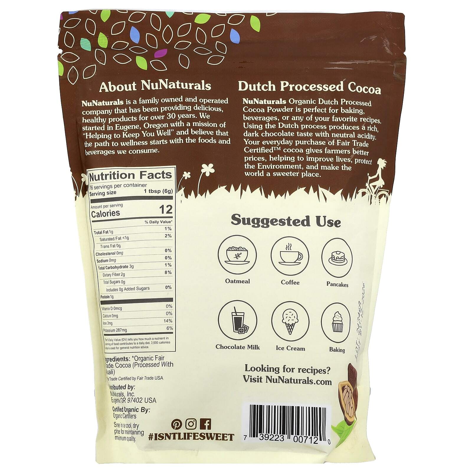 Органический какао-порошок NuNaturals, обработанный в Нидерландах, идеально подходит для выпечки, напитков и любого из ваших любимых рецептов. Использование голландского процесса позволяет получить насыщенный вкус темного шоколада с нейтральной кислотностью.