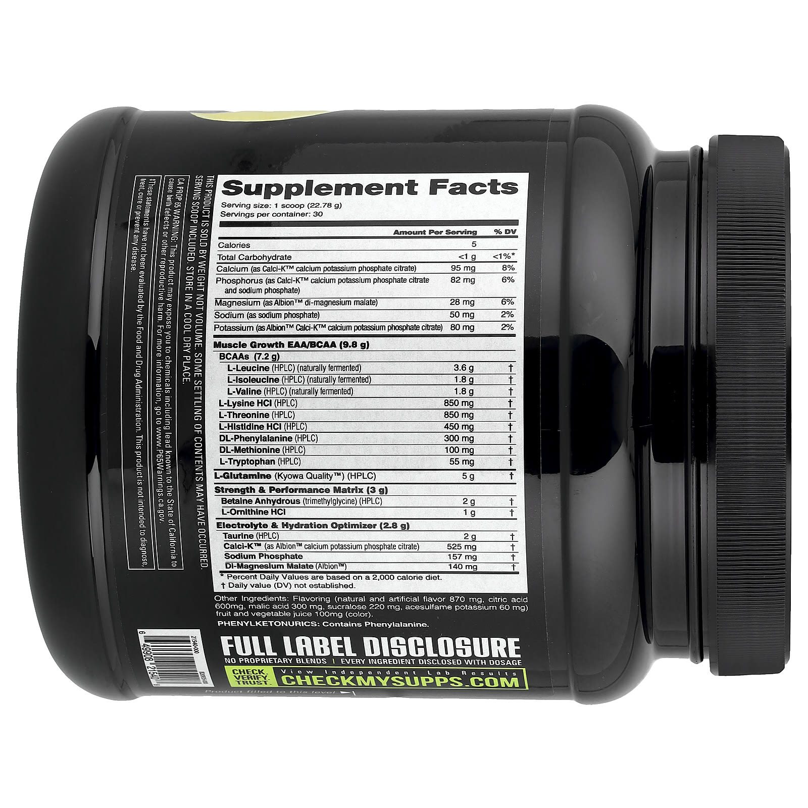 | Электролиты и оптимизатор гидратации Таурин (ВЭЖХ) Calci-K™ (в виде фосфата и цитрата кальция и калия Albion™) Фосфат натрия Малат Dl-магния (Albion™) | (2,8 г) 2 г 525 мг 157 мг 140 мг | † † † |
