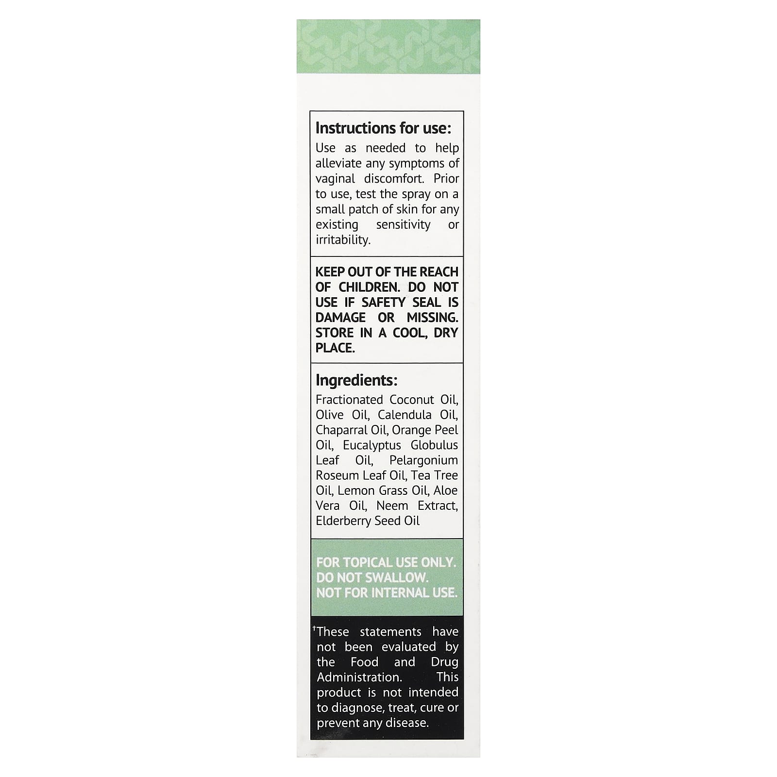 Используйте по мере необходимости для облегчения симптомов дискомфорта во влагалище. Перед использованием проверьте спрей на небольшом участке кожи на наличие чувствительности или раздражительности.